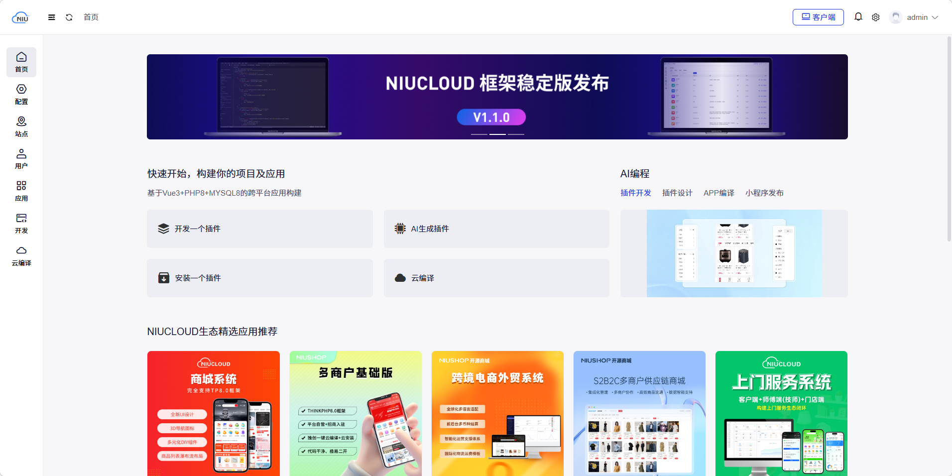 NIUCLOUD SAAS 框架:主打多站点、多应用的通用开发能力,深度封装插件、多站点等核心集成功能,适配企业级复杂系统开发,各应用模块独立运行、互不影响,保障系统稳定性与扩展性