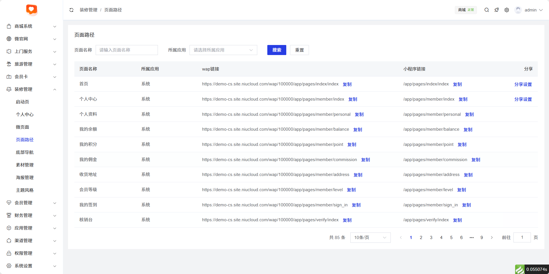 页面路径可查看wap链接,小程序的链接,为装修时创建跳转链接时可直接复制跳转链接,提供便利操作。
