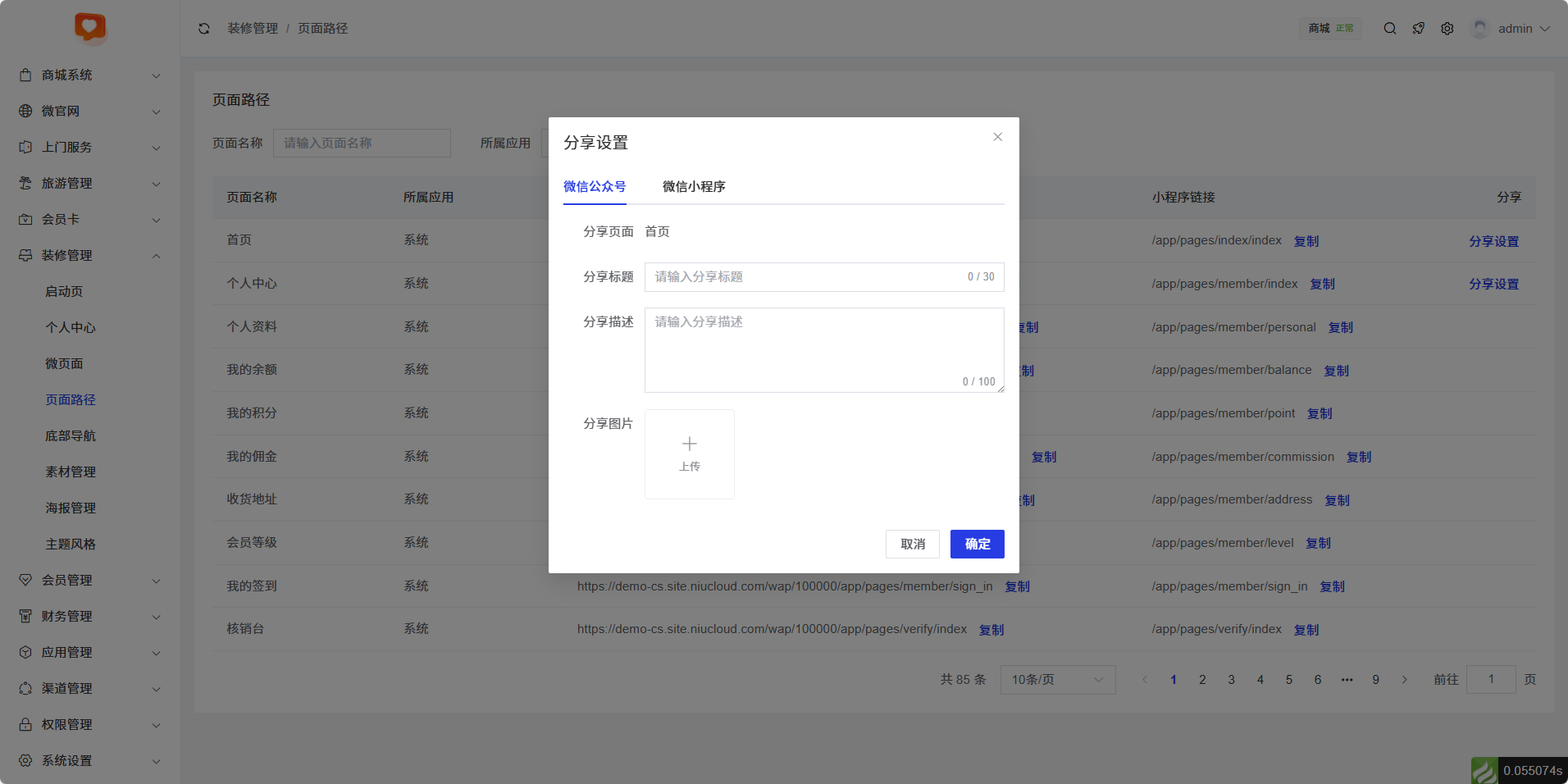 可对页面名称,所属应用来进行快速筛选页面路径内容,点击分享设置可以对微信公众号/微信小程序进行分享设置。