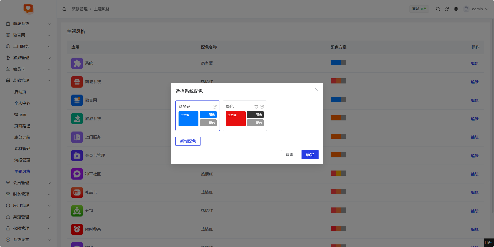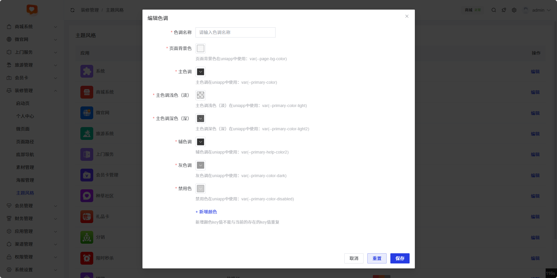 点击编辑,选择新增配色,填写色调名称、页面背景色、主色调等信息。