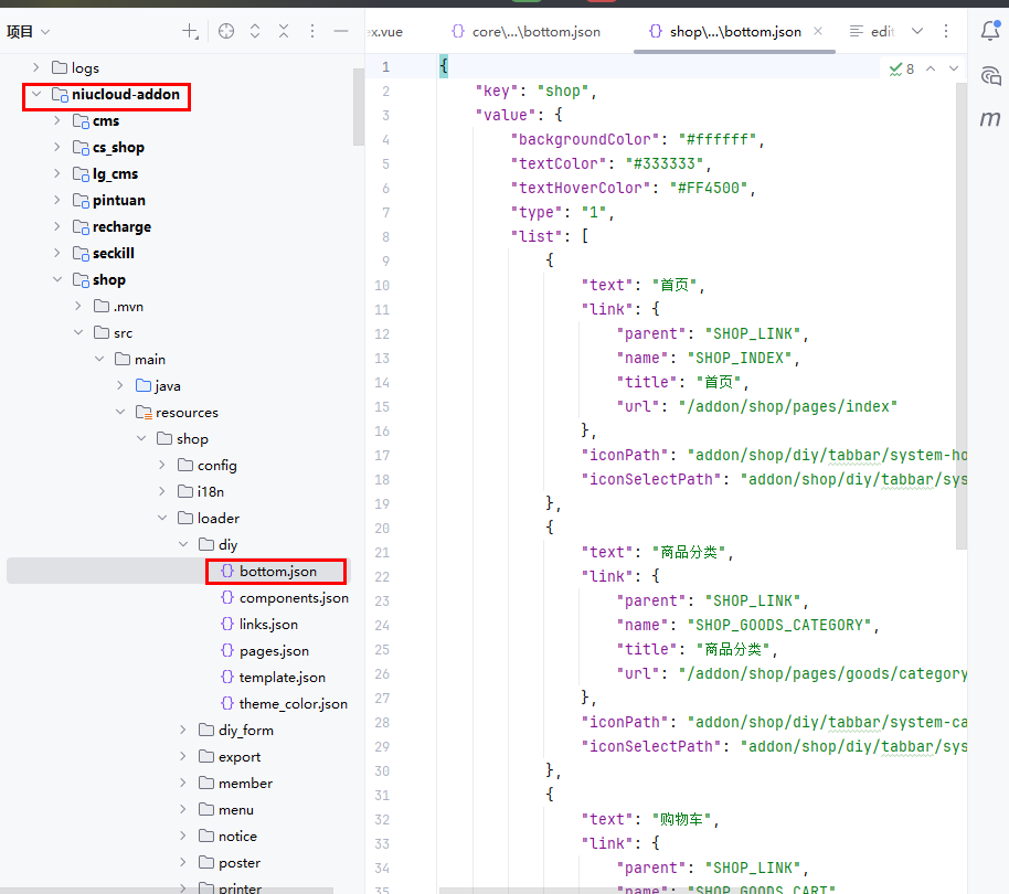 插件底部导航文件位置:niucloud-addon/shop/src/main/resources/shop/loader/diy/bottom.json