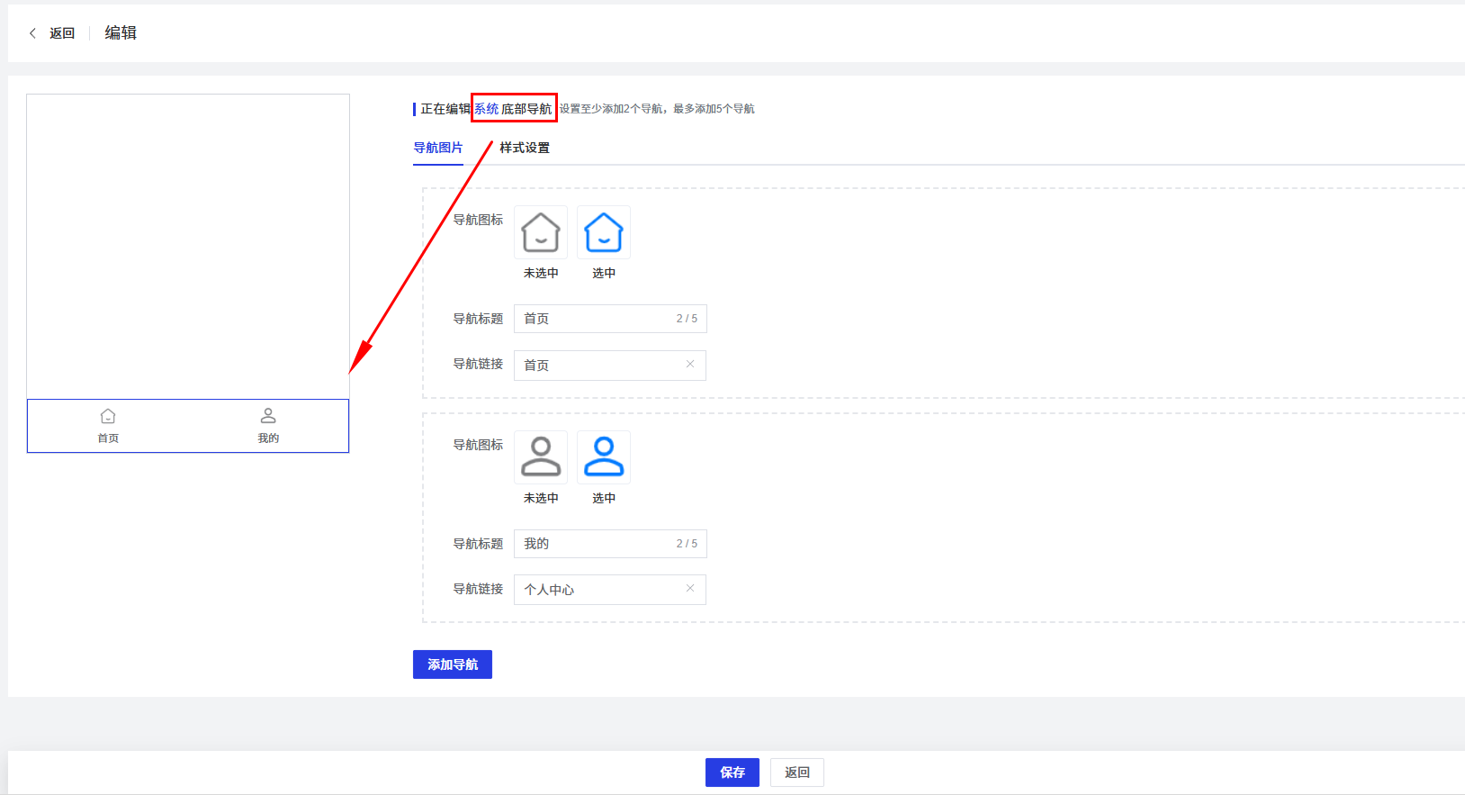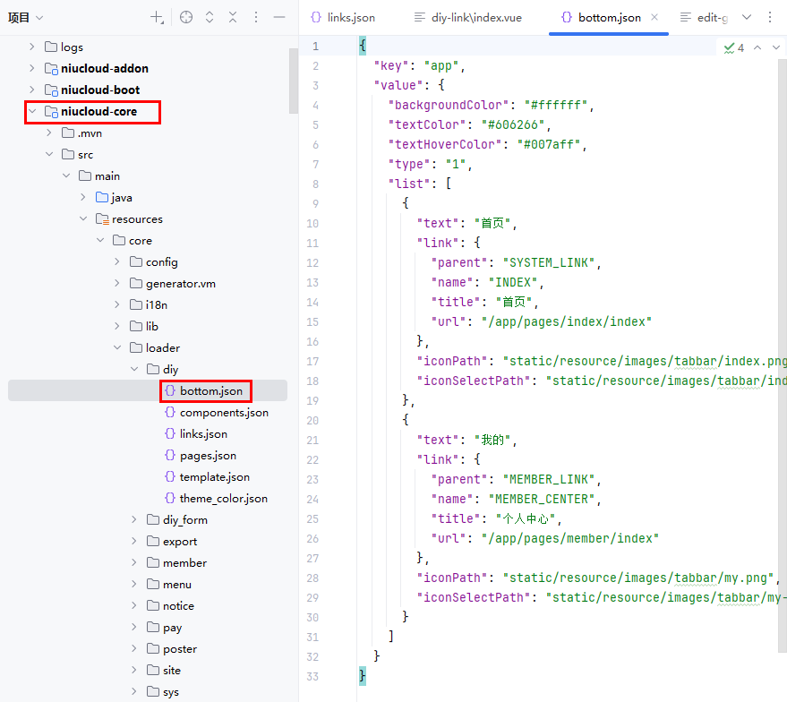 系统底部导航文件位置:niucloud-core/src/main/resources/core/loader/diy/bottom.json
