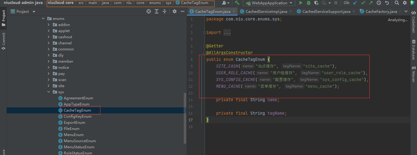 缓存定义,系统的缓存在 sys 下的 cacheEnum 类,插件在各自插件内部定义