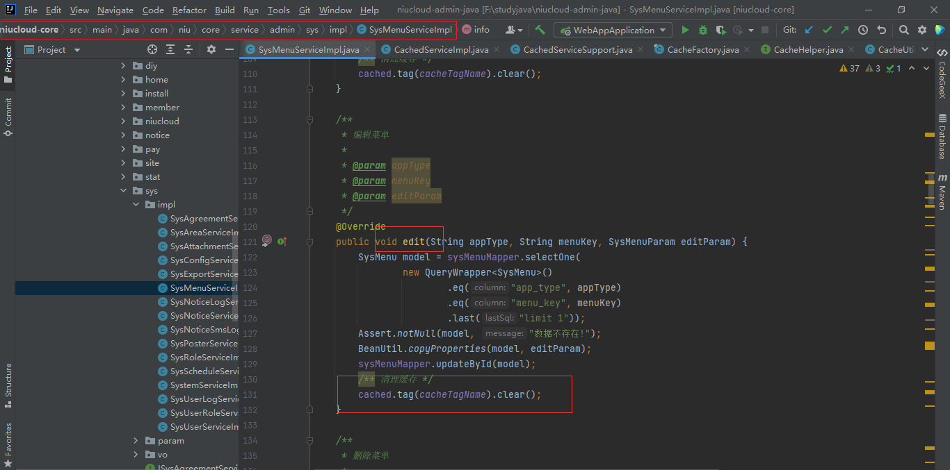 注意使用 cache 一般是相对不变的数据,同时注意缓存清除节点,比如上面的菜单做缓存,针对菜单添加,编辑,删除,插件安装整体处理菜单等方法要注意菜单清理,菜单清理使用,cached.tag(“标签名称”).clear()