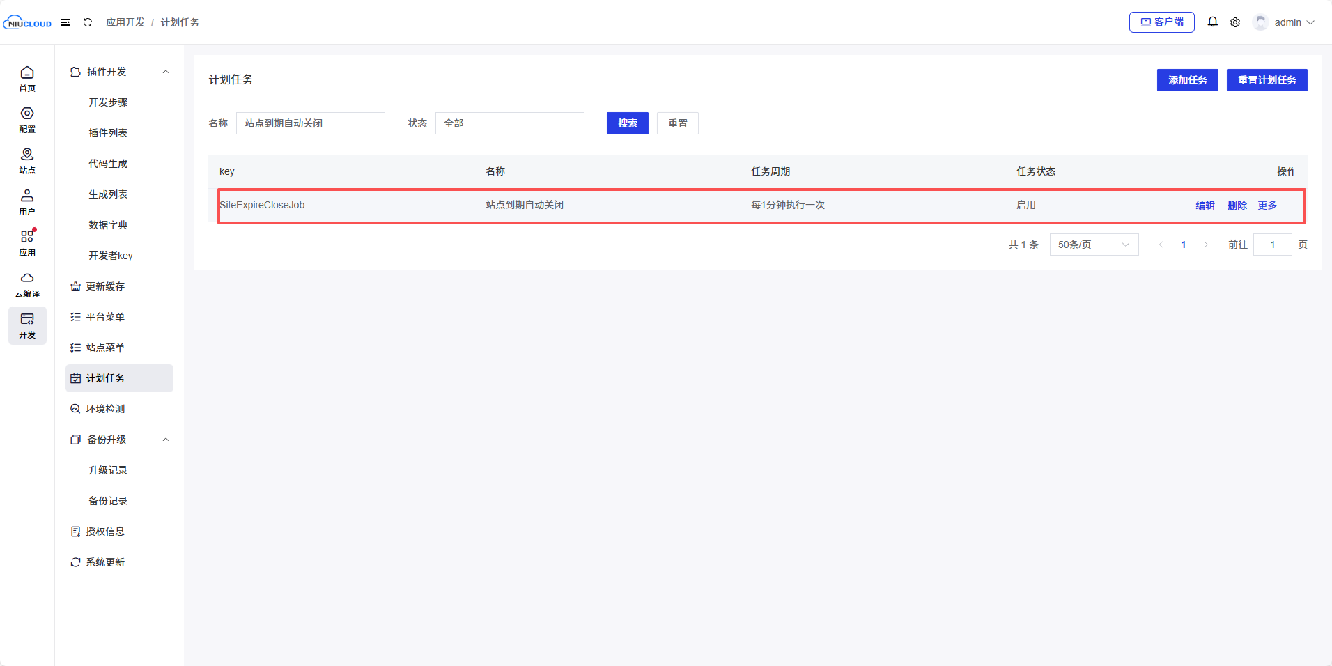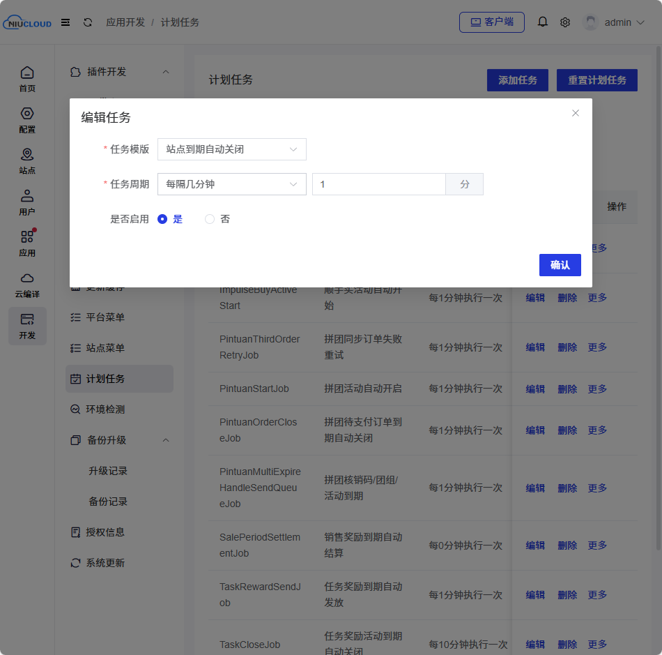 Niucloud 计划任务使用 Quartz 的定时任务框架,Quartz 是一个完全由 Java 编写的开源任务调度的框架,通过 触发器 设置作业定时运行规则,控制作业的运行时间。其中 quartz 集群通过故障切换和负载平衡的功能,能给调度器带来高可用性和伸缩性。主要用来执行定时任务,如:定时发送信息、定时生成报表等等。关于 Quartz 的详细说明,可以查看 Quartz Enterprise Job Scheduler。下面从站点过期关闭的任务说明计划任务的添加与配置。