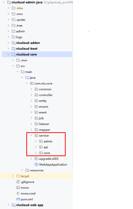 Service 层采用分层架构设计,将不同端口的业务逻辑进行隔离和统一管理。在系统或插件的 service 目录下,通常包含 admin、api 和 core 三个子目录,分别对应不同接口类型的业务逻辑实现。