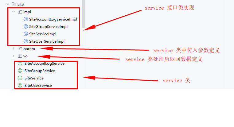 下面是关于站点相关的 service 服务实例。创建 service 接口类,命名规范是 ISiteService