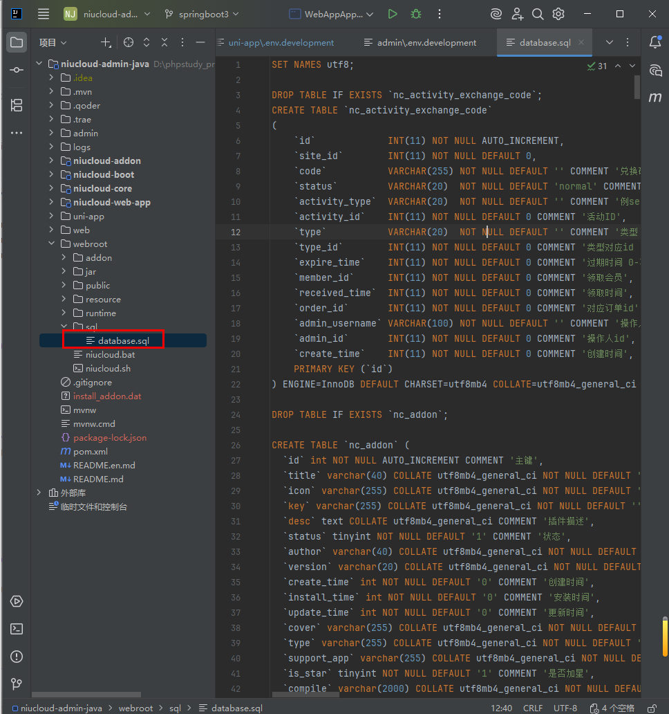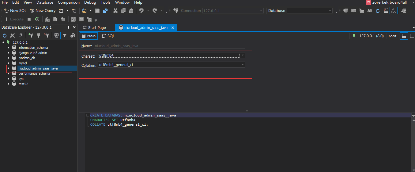 创建数据库,这里创建的数据库名是 niucloud_admin_saas_java , 注意数据库 charset 选择 utf8mb4 ,collation 选择 utf8mb4_general_ci