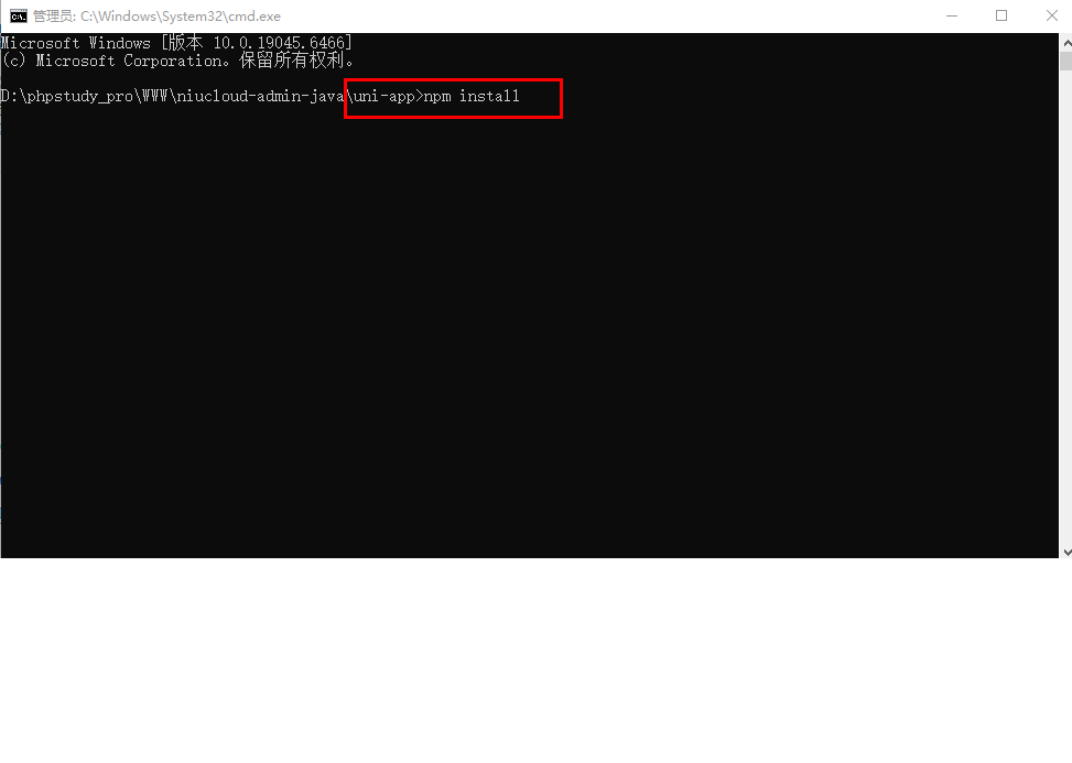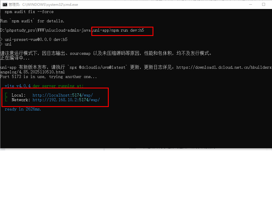 VITE_SITE_ID = 303下面开始启动 nodejs 的命令行运行,打开对应 uniapp 目录,首先执行 npm install 安装依赖