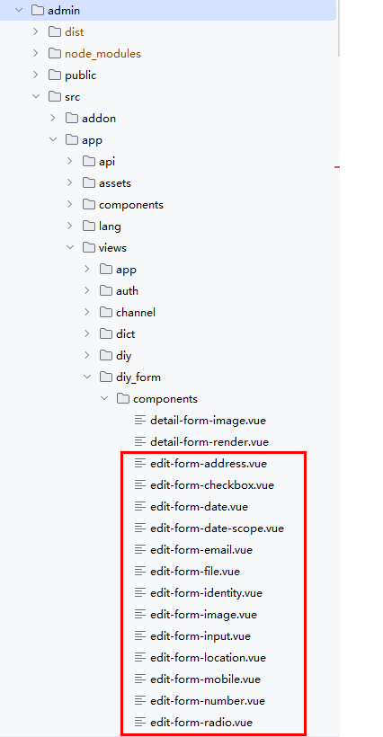 框架定义的自定义表单组件目录为:admin/src/app/views/diy_form/components