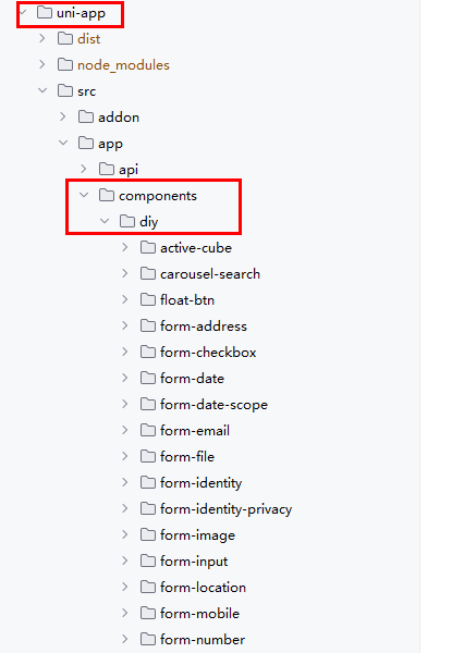 框架定义的自定义组件目录为:uni-app/src/app/components/diy(与自定义组件都在一个目录下)