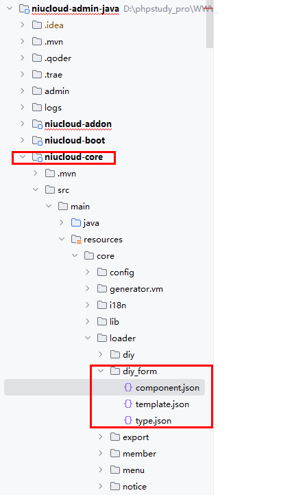 框架开发的的自定义功能代码位置:niucloud-core/src/main/resources/core/loader/diy_form/