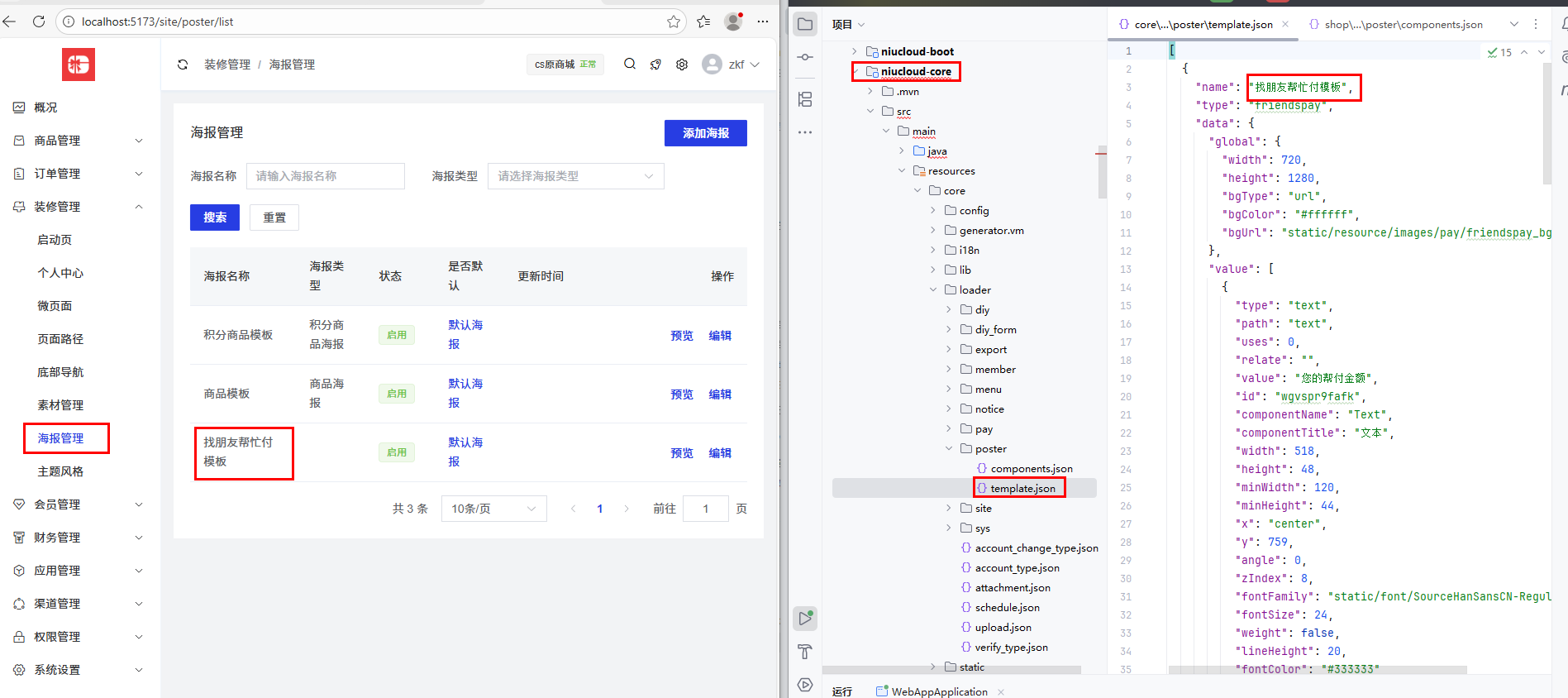 系统内置了海报装修页面,位于管理后台,开发者无需自行开发前端装修界面。装修页面支持拖拽操作、组件属性编辑、模板选择等功能。