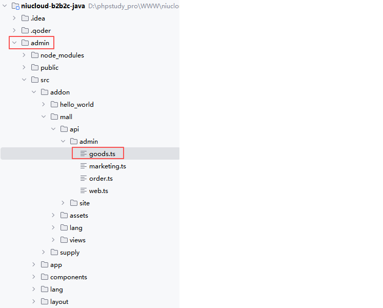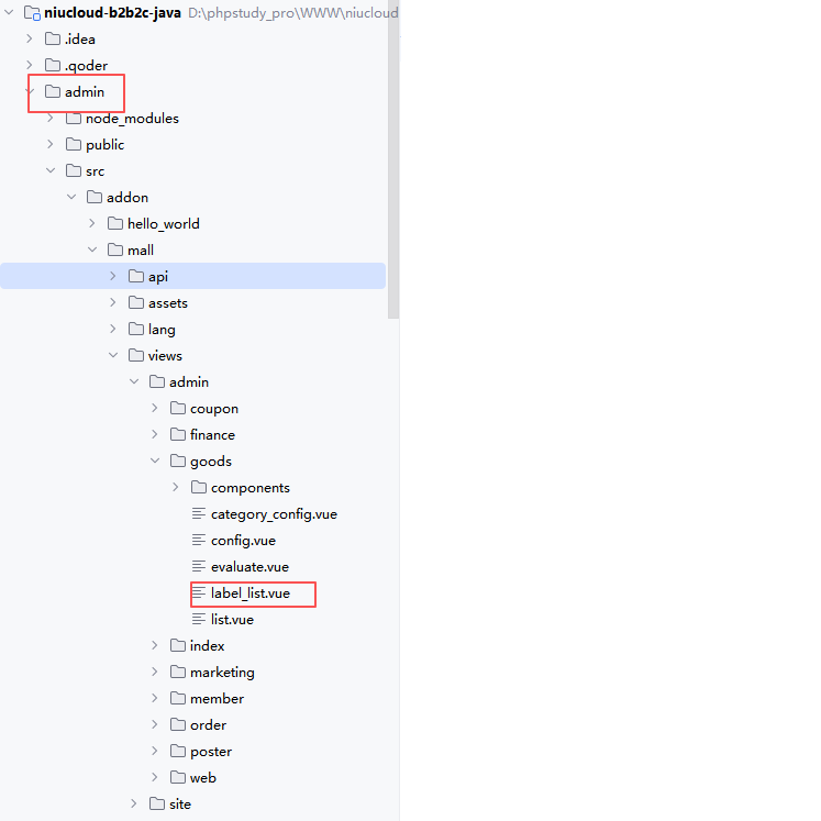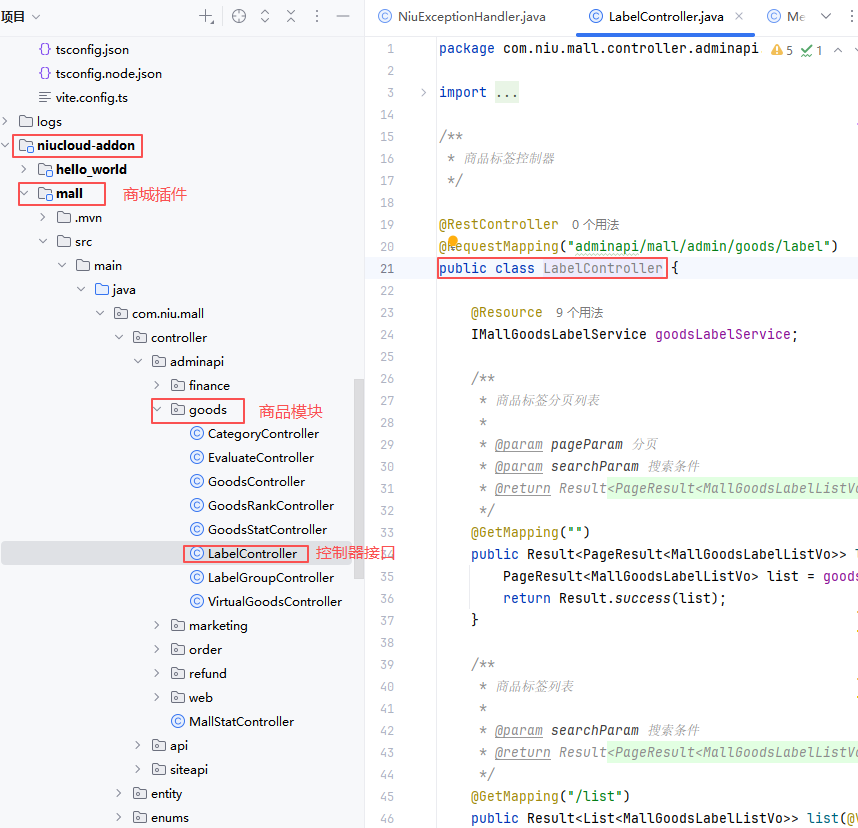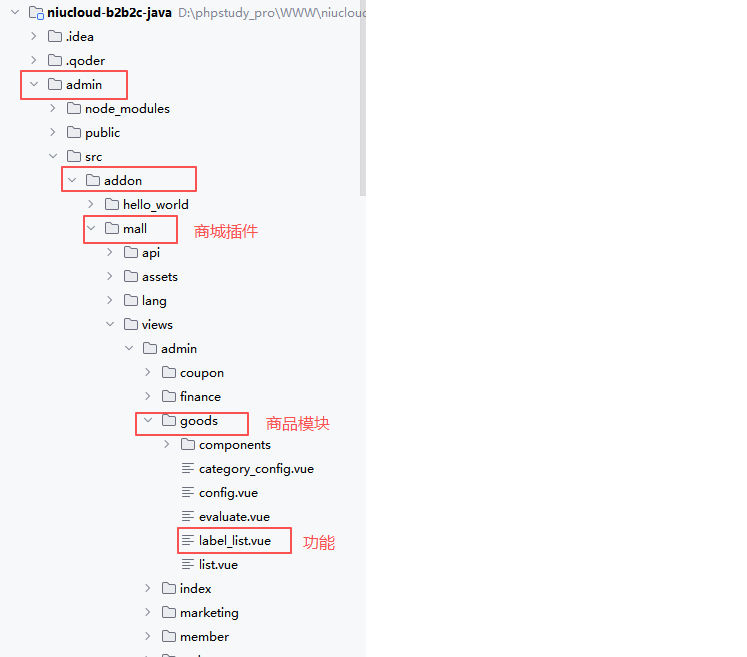 开发具体功能之前要分析功能所在插件以及模块,如果是框架功能,java 代码是在 niucloud-core 下面功能模块下,管理端前端代码是在 admin 的 app 下的功能模块下。而商品标签是商城插件下商品功能板块的子项功能