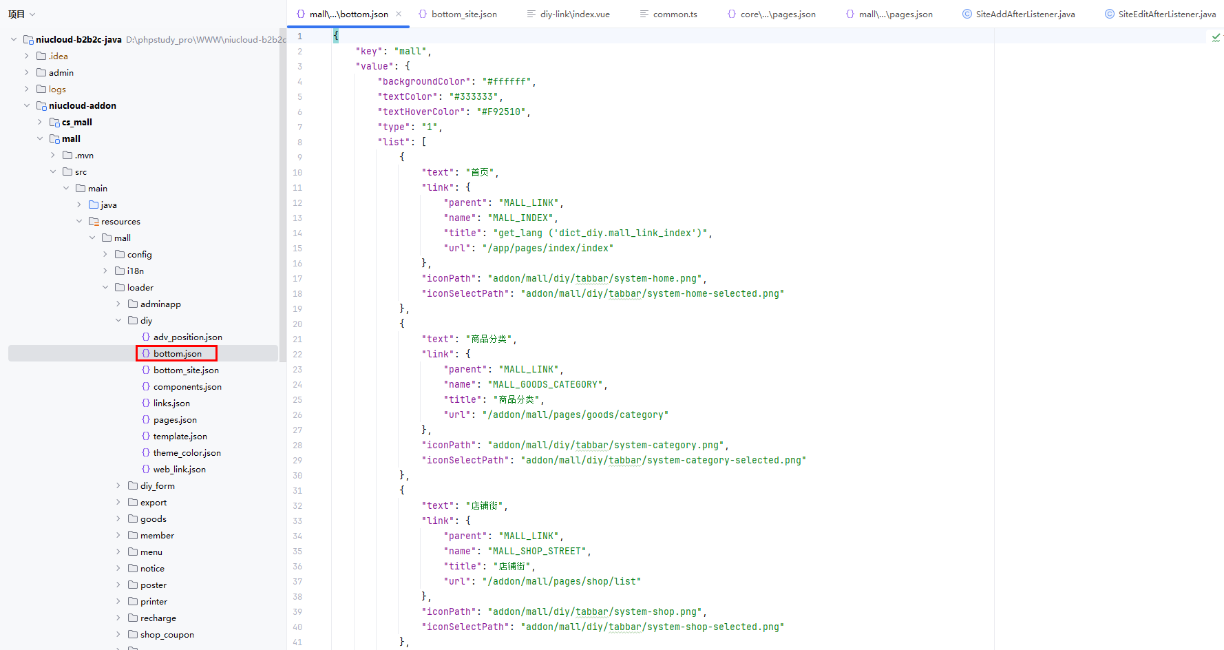 插件底部导航文件位置:niucloud-addon/mall/src/main/resources/mall/loader/diy/bottom.json