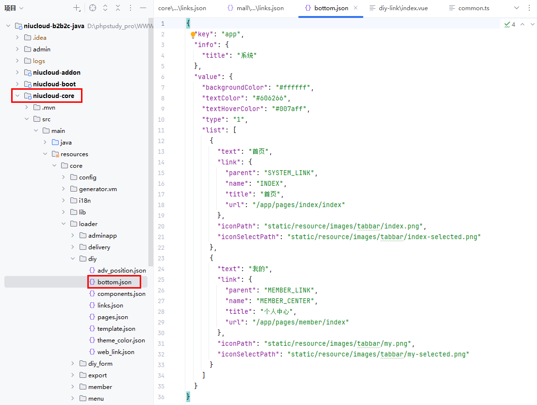 系统底部导航文件位置:niucloud-core/src/main/resources/core/loader/diy/bottom.json