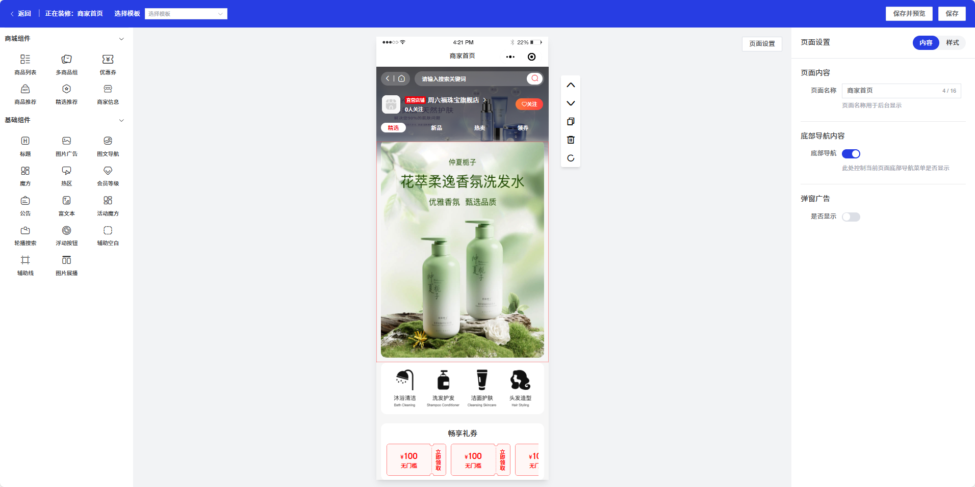 装修界面采用三栏式布局:左侧展示组件库供用户选择,中间区域提供实时预览功能,右侧面板用于编辑和配置所选组件的各项属性