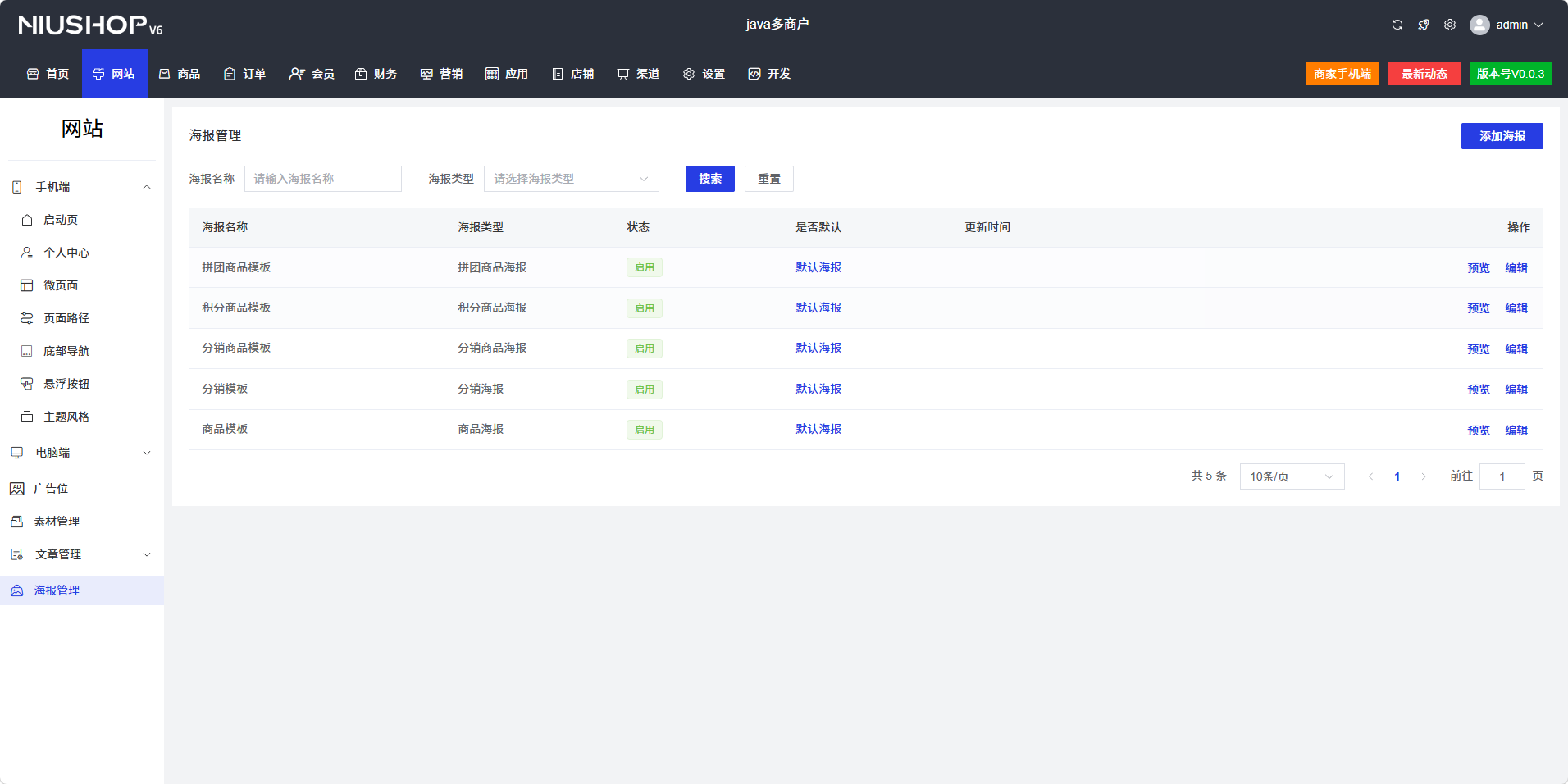 系统内置了海报装修页面,位于管理后台,开发者无需自行开发前端装修界面。装修页面支持拖拽操作、组件属性编辑、模板选择等功能。