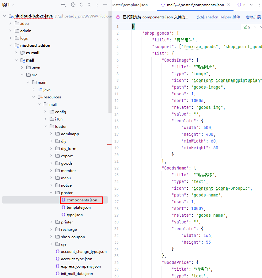 定义海报组件文件位置:niucloud-addon/mall/src/main/resources/mall/loader/poster/components.json