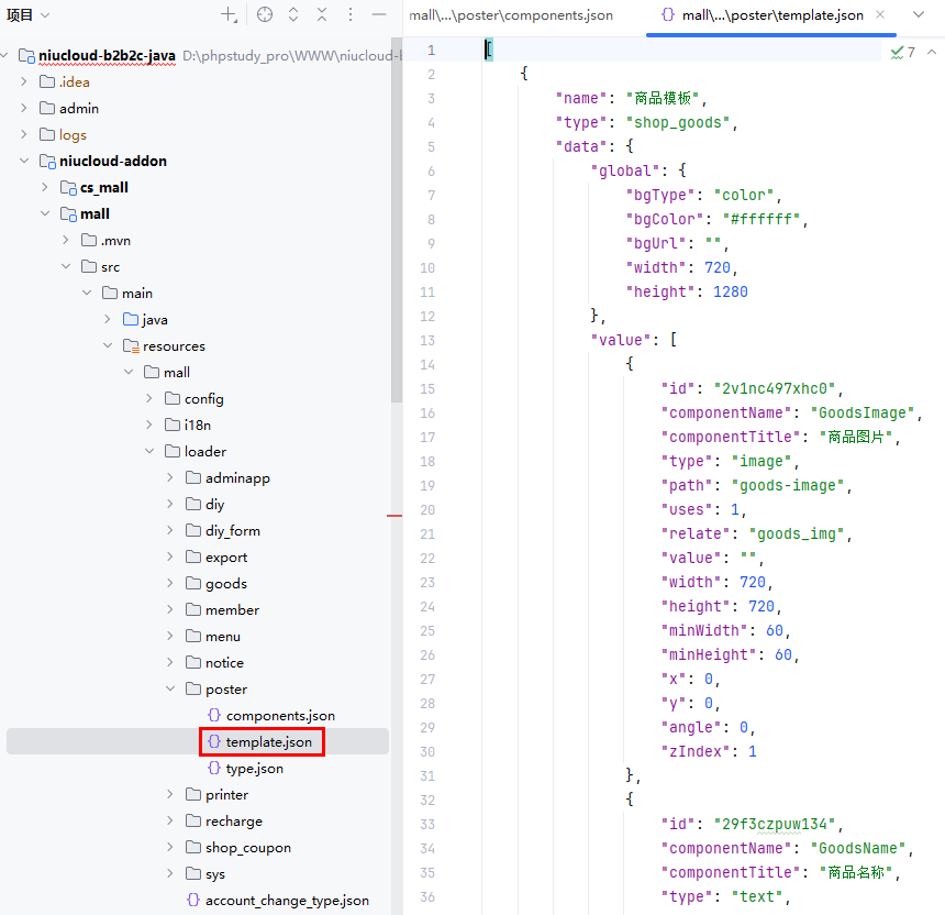 定义海报模板文件位置:niucloud-addon/mall/src/main/resources/mall/loader/poster/template.json