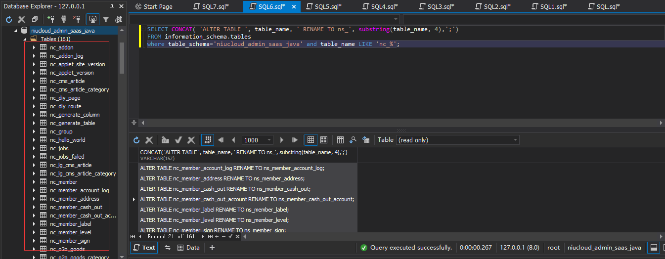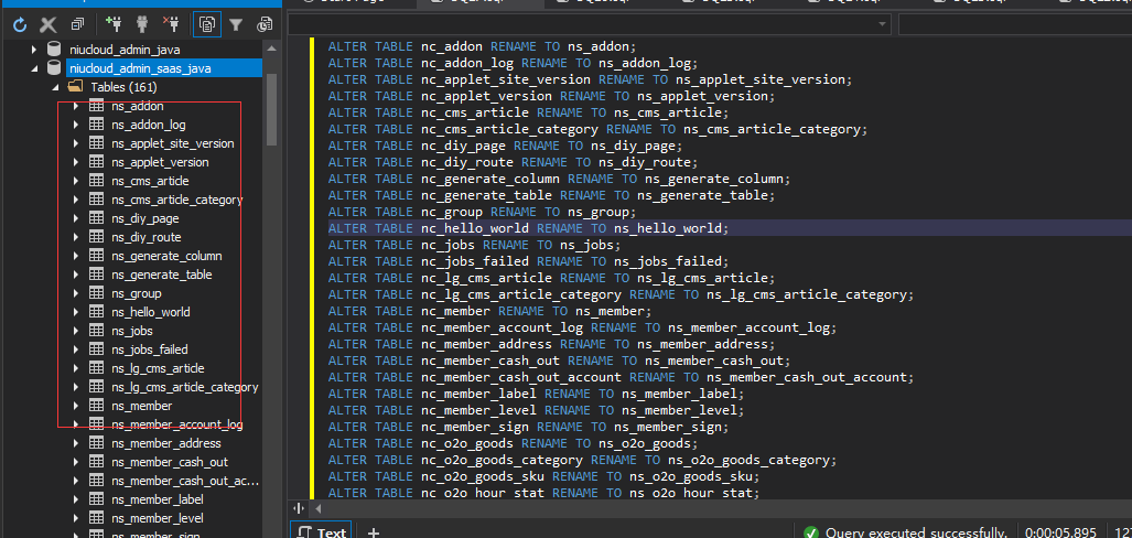 where table_schema='niucloud_admin_saas_java' and table_name LIKE 'nc_%';执行后生成生成sql语句,如下所示
