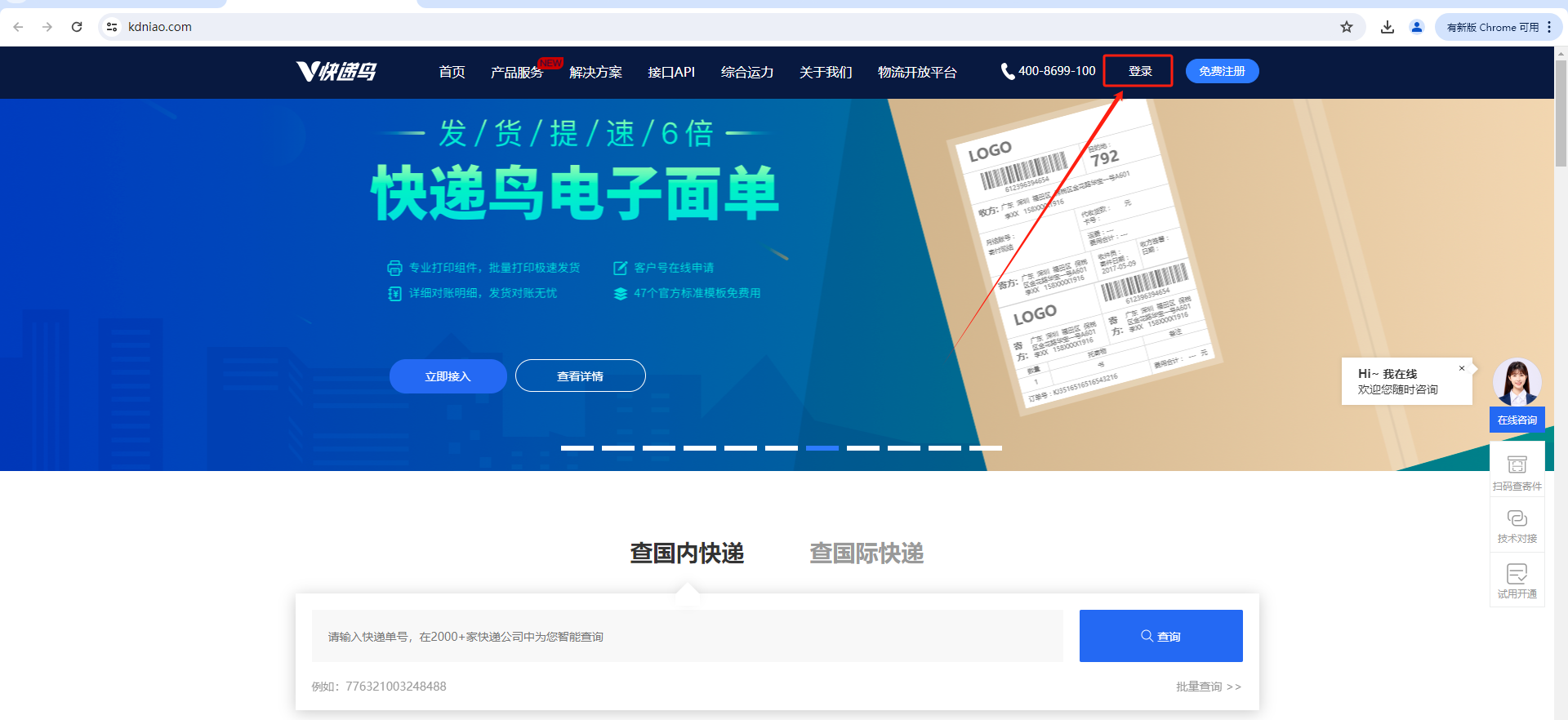 快递鸟链接:https://www.kdniao.com/,点击登录