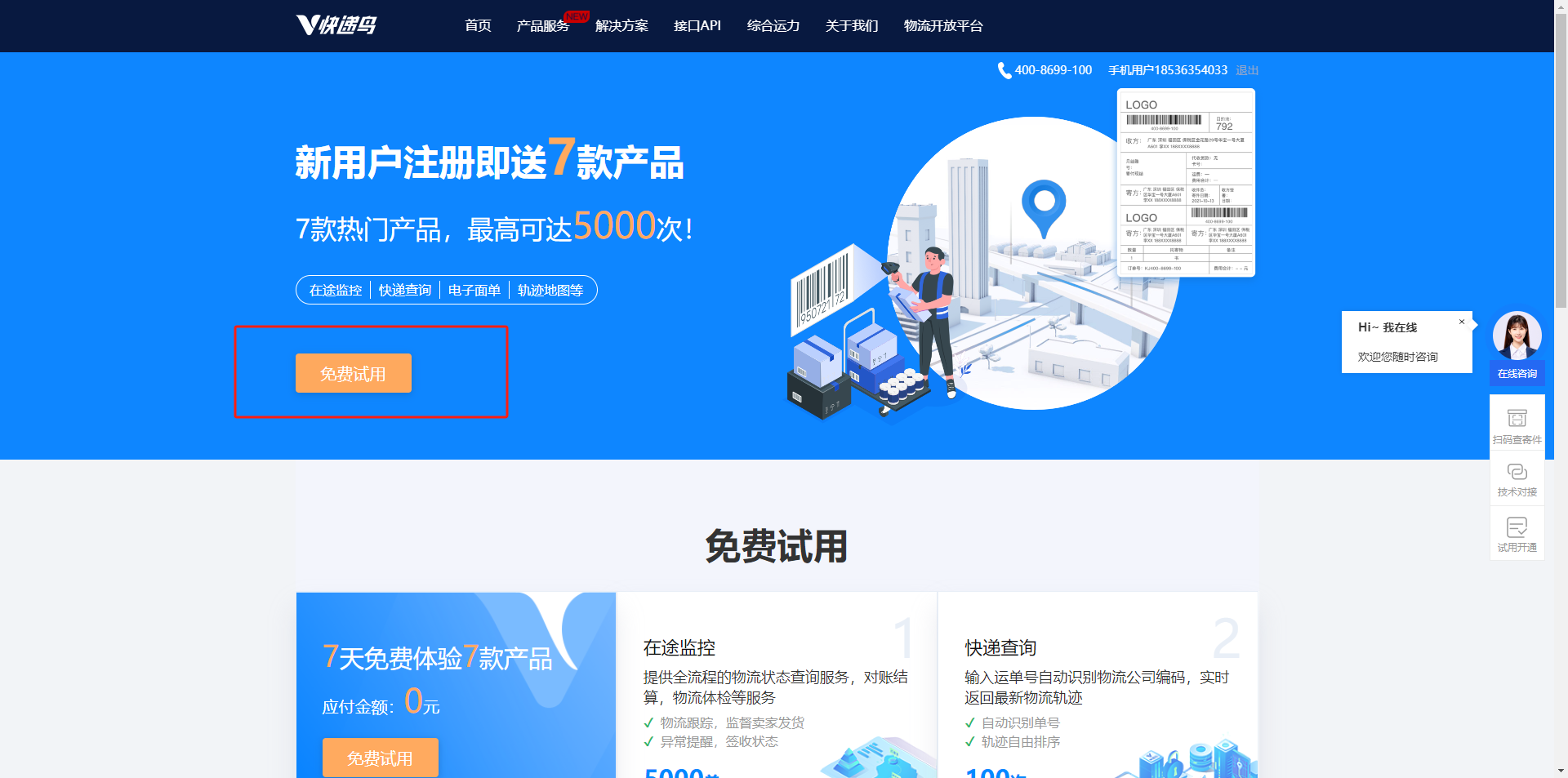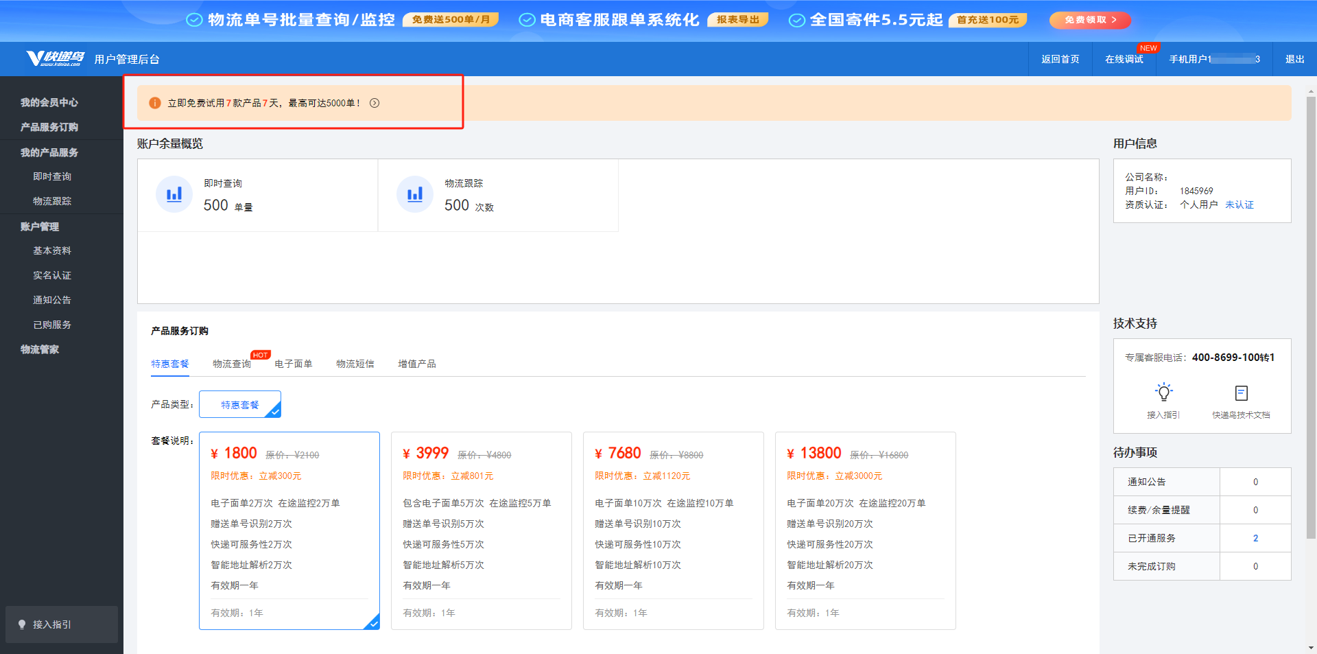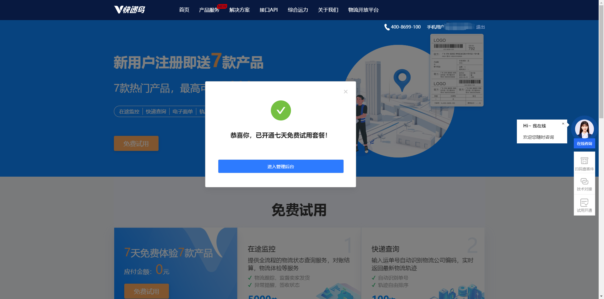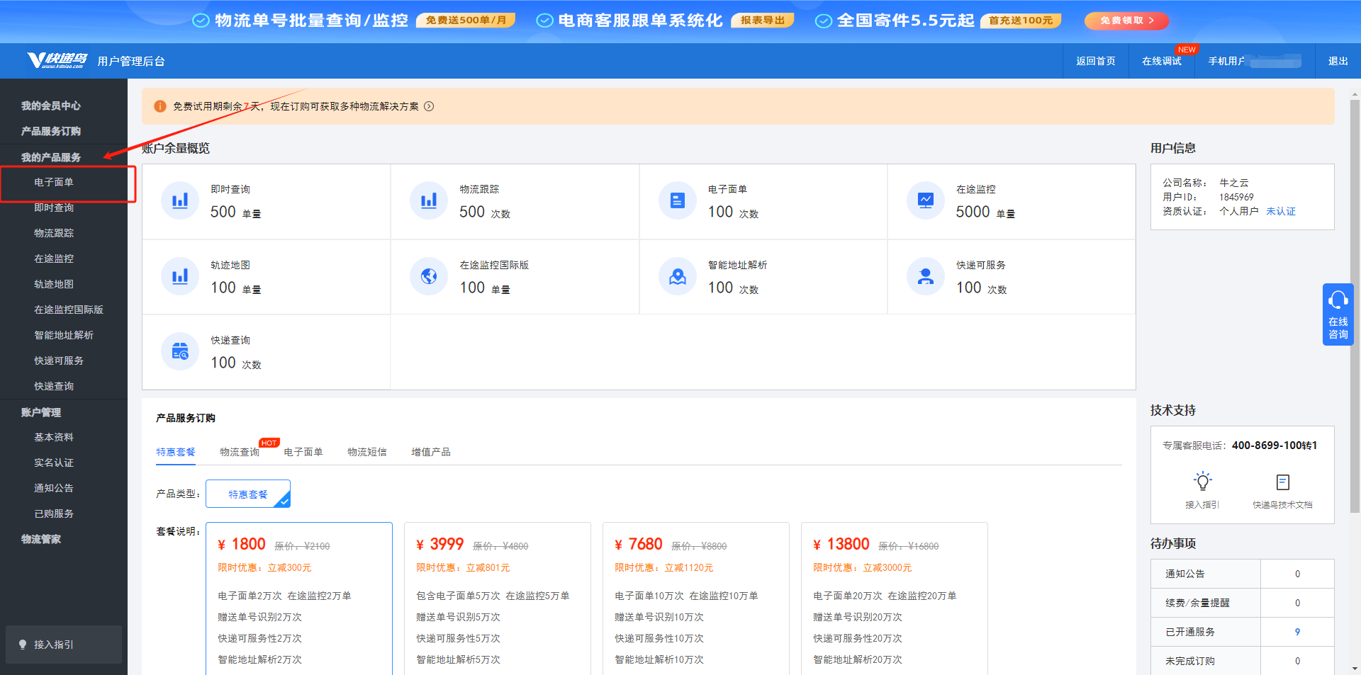 登录后,可选择使用7天体验,也可以购买电子面单套餐