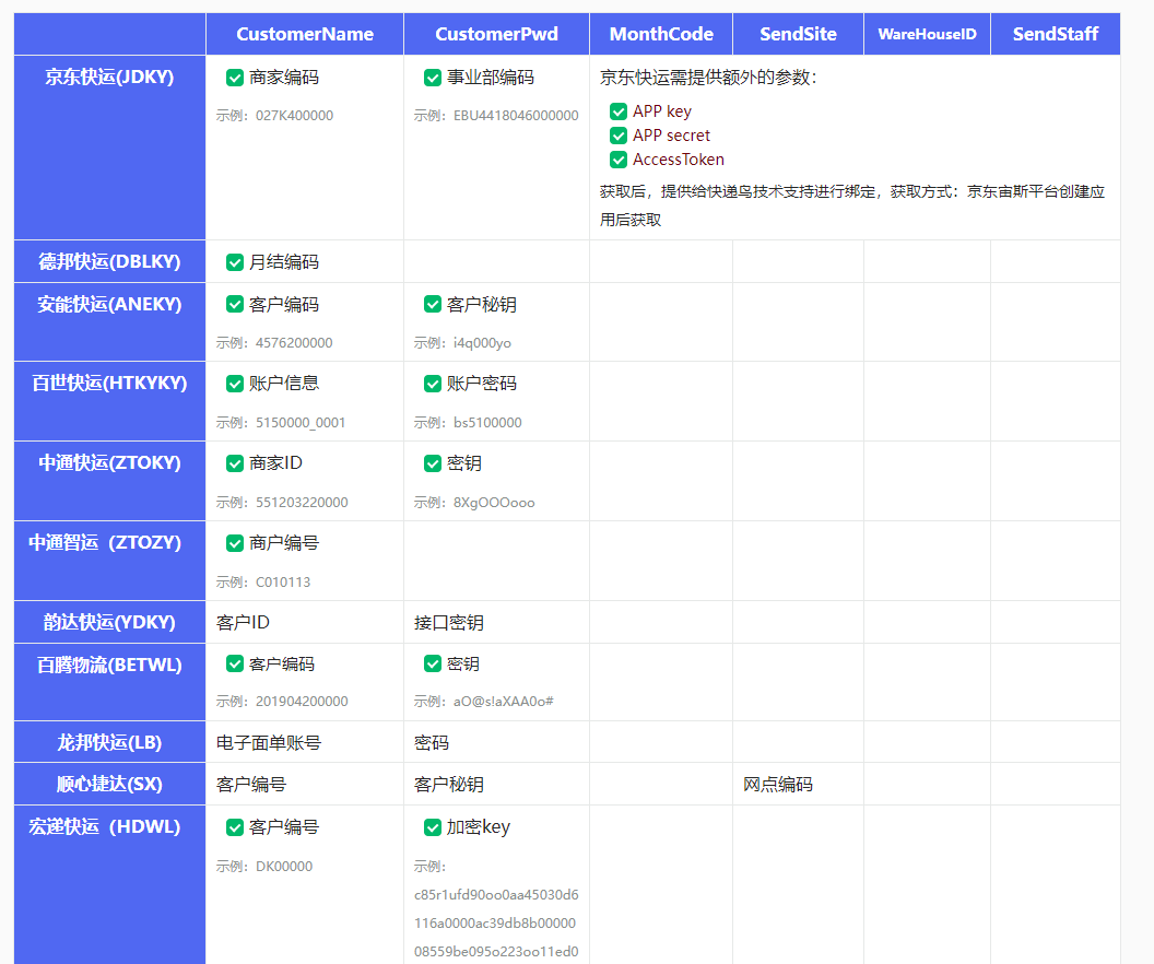 电子面单账号对照表:https://www.yuque.com/kdnjishuzhichi/dfcrg1/hrfw43