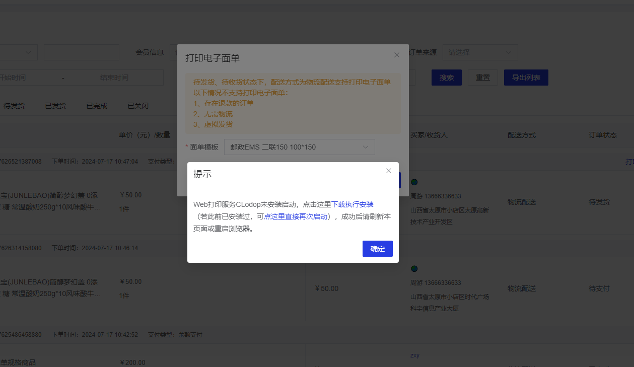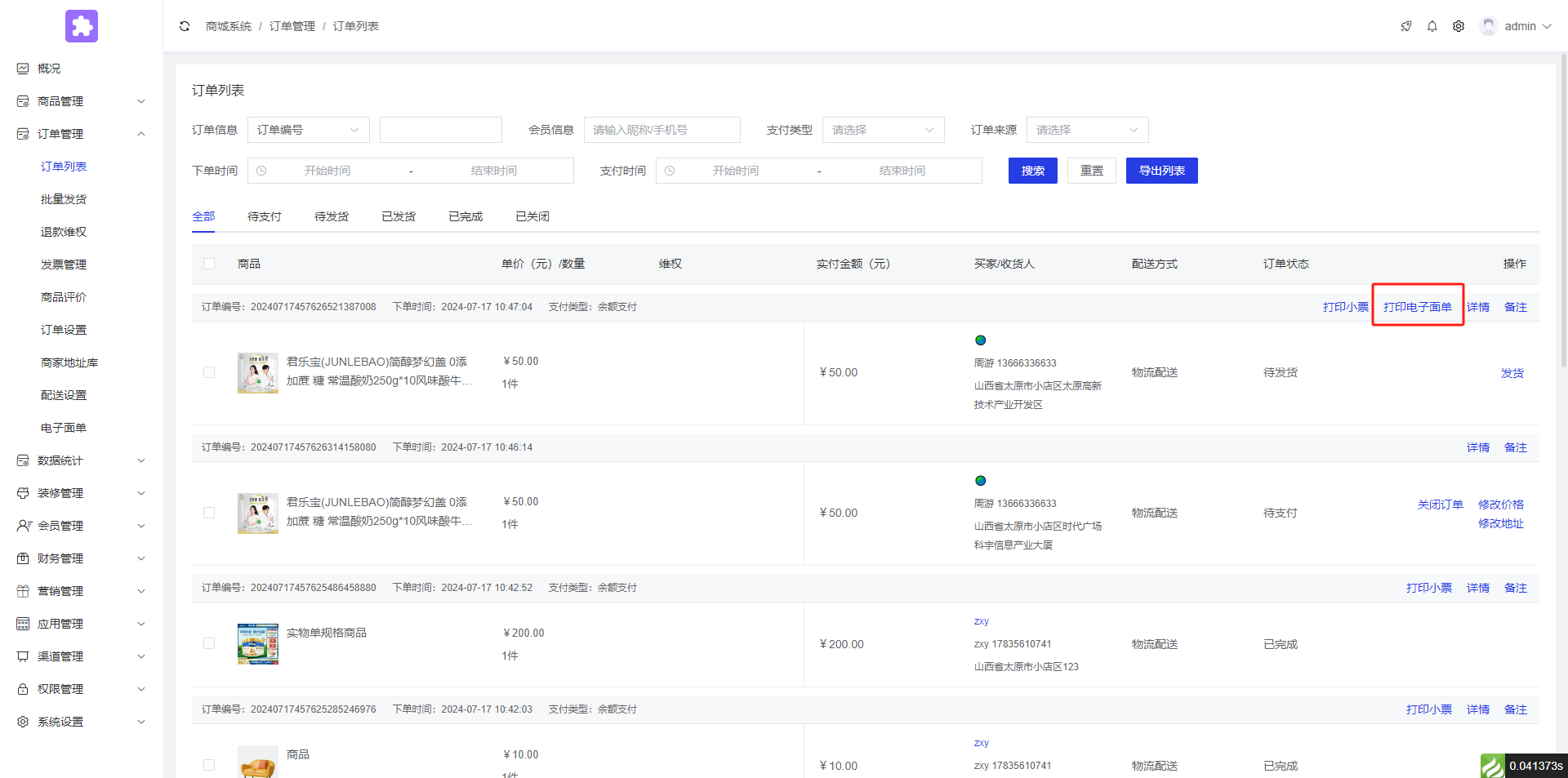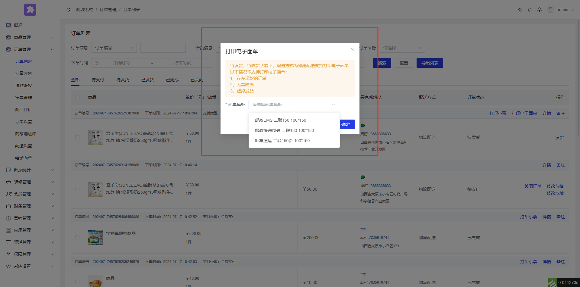 后台点击订单管理--订单列表,选择想要打印的电子面单(注意:已发货状态下可以打印电子面单)