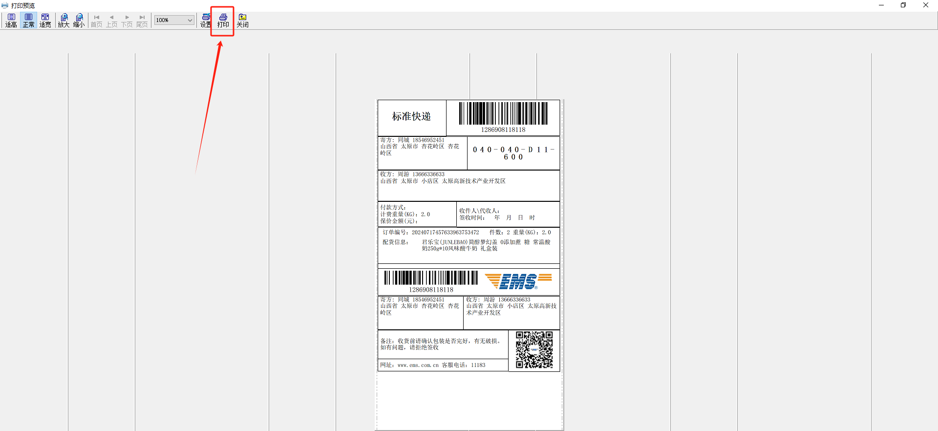 点击确定后即可跳转到打印界面,点击打印即可