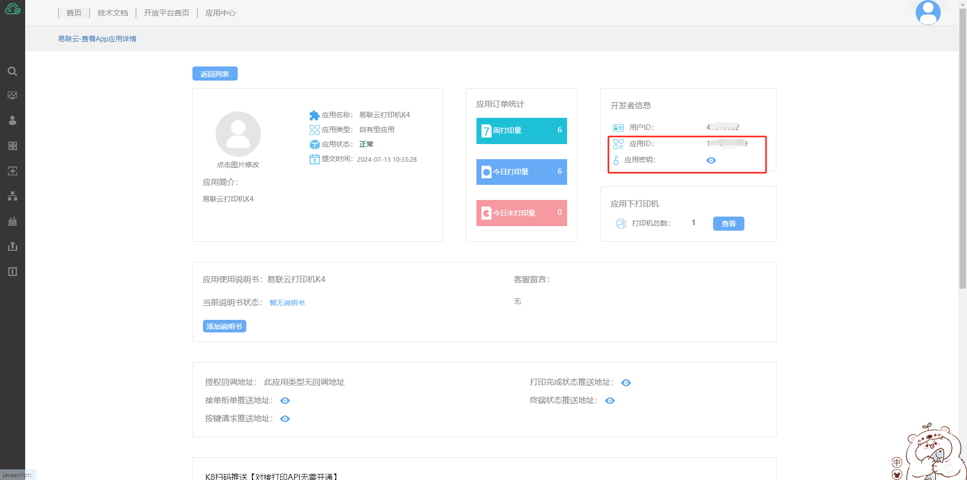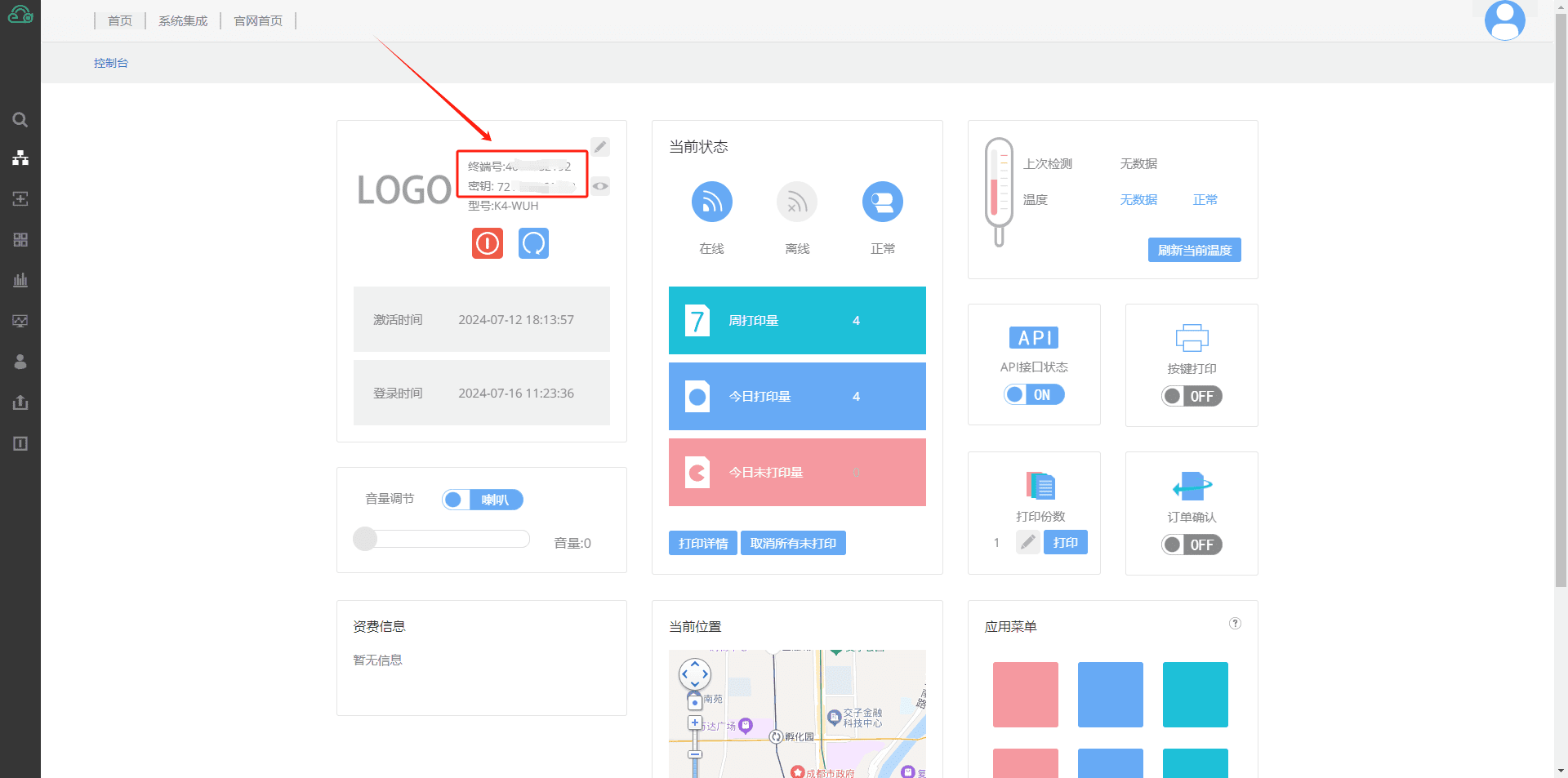 5.在打印机控制台中可以控制打印机设置,以及查看终端号和密钥
