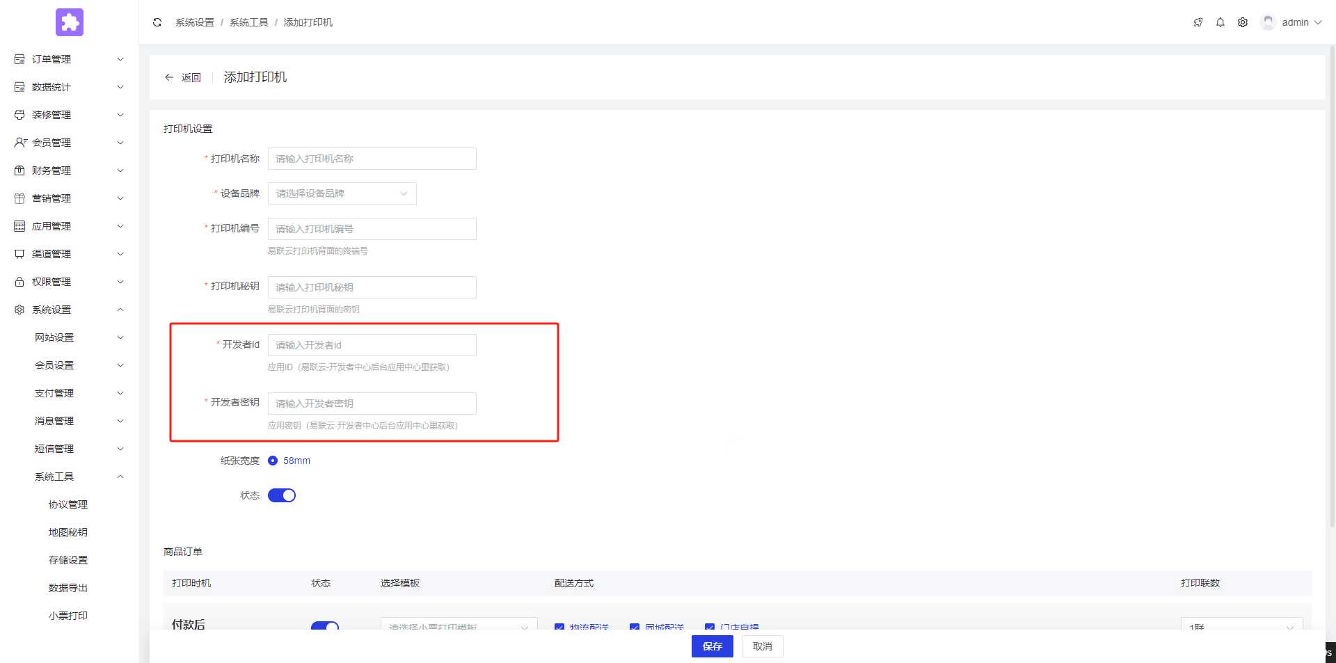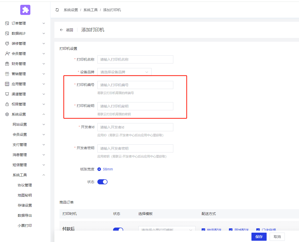 将终端号和密钥分别填写到后台打印机编号和打印机秘钥中