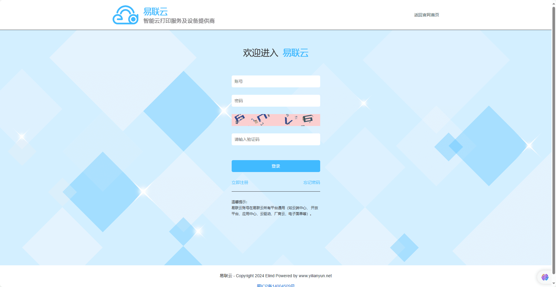 1.打开易联云官网https://yilianyun.10ss.net,输入账号密码登录。