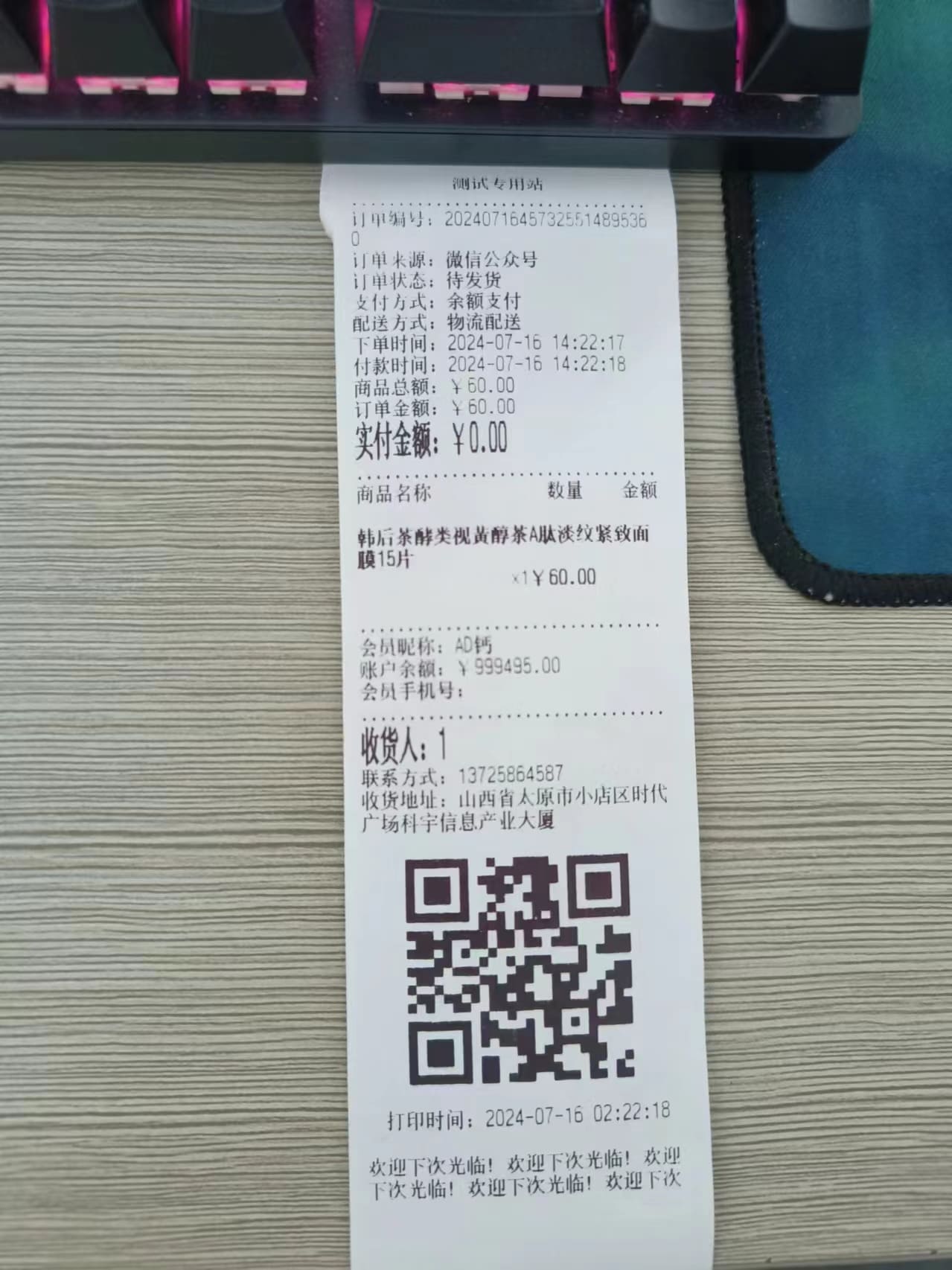 小票打印成功展示:
