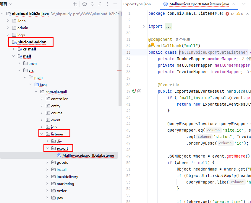文件位置: niucloud-addon/插件名称/src/main/java/com/niu/插件名称/listener/export/MallInvoiceExportDataListener.java