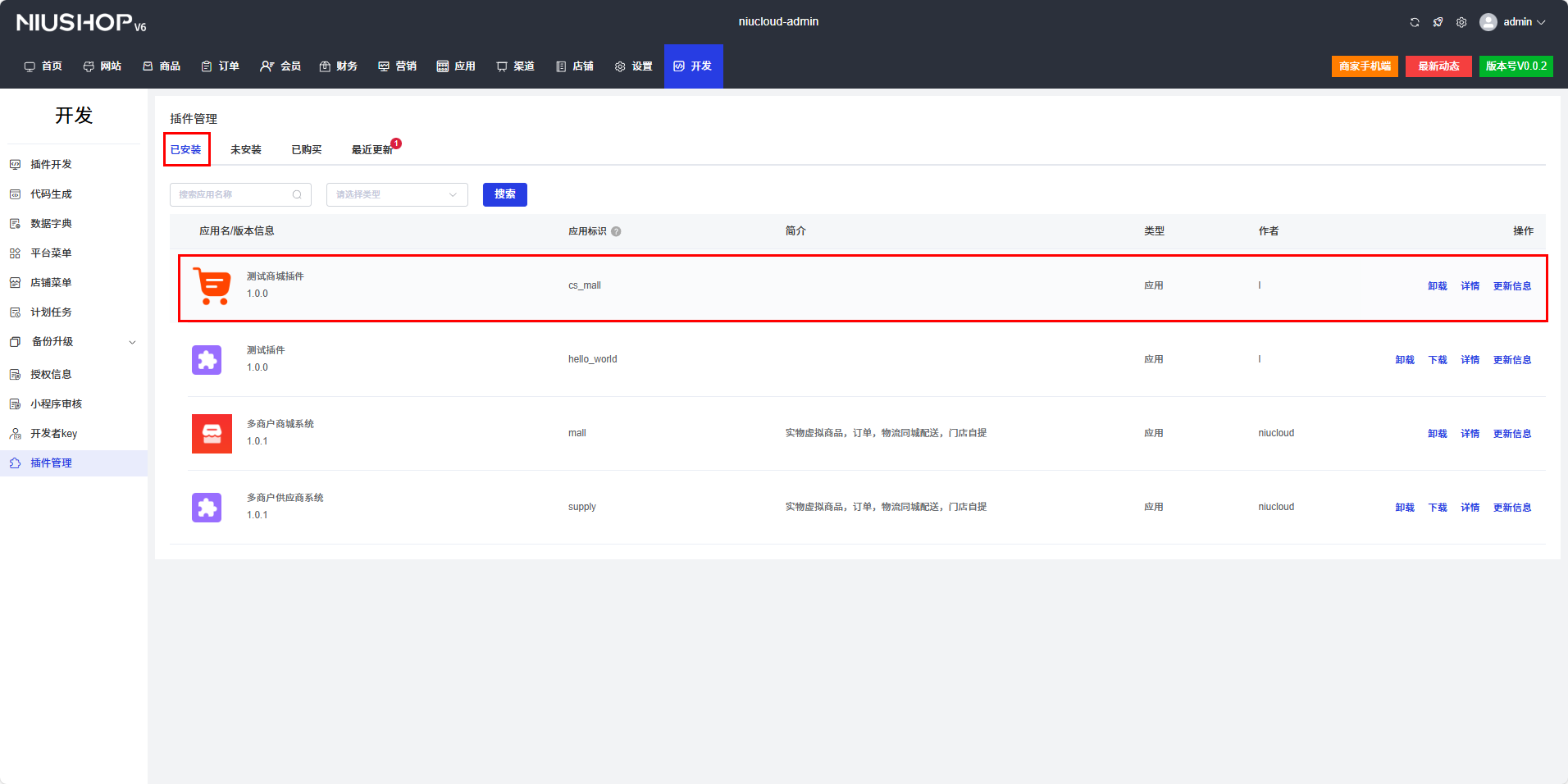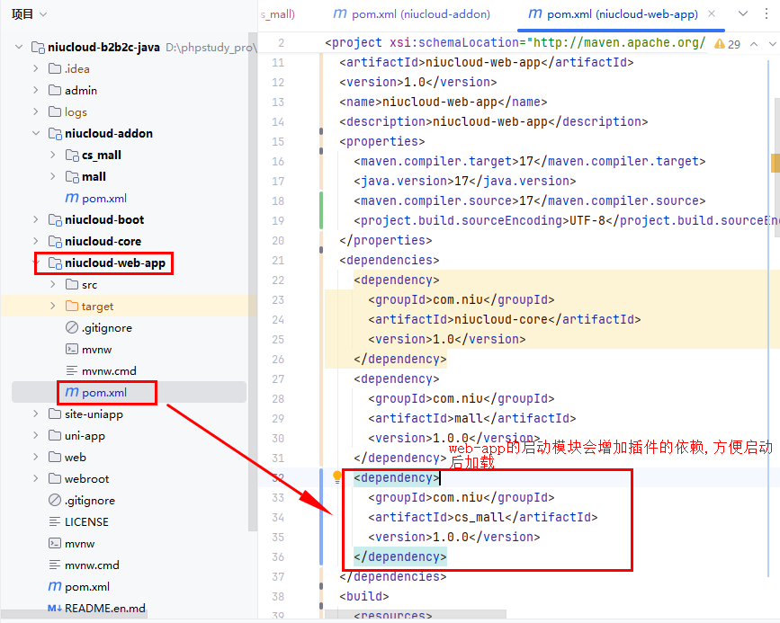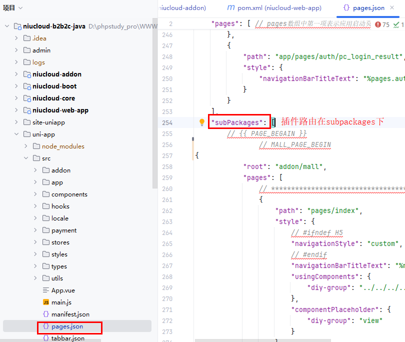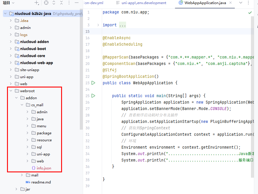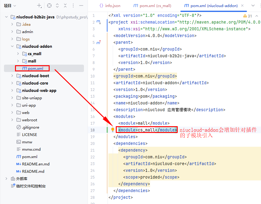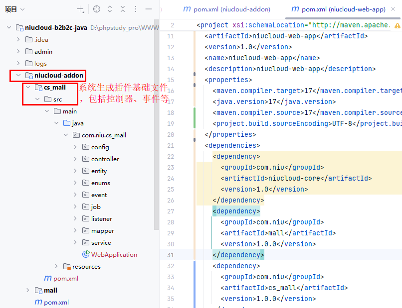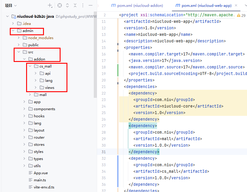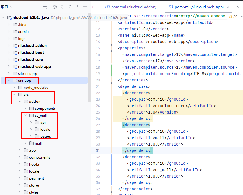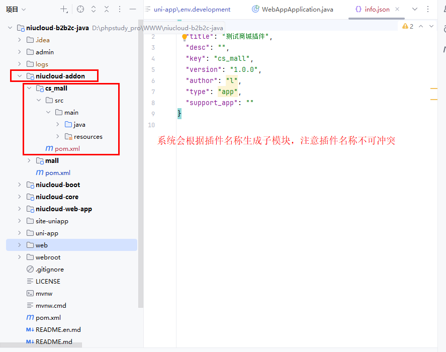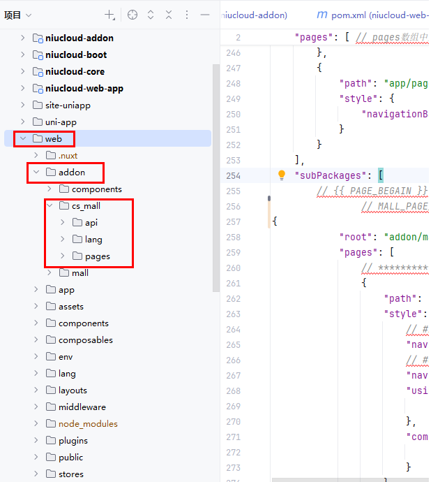 插件安装后,代码会合并到 niucloud-addon 目录下,admin 代码会合并到系统 admin 前端目录下面,uni-app 代码会合并到系统 uni-app 目录下面,web 目录会合并到系统 web 目录下面,下面说明合并的过程细节,方便后期继续开发