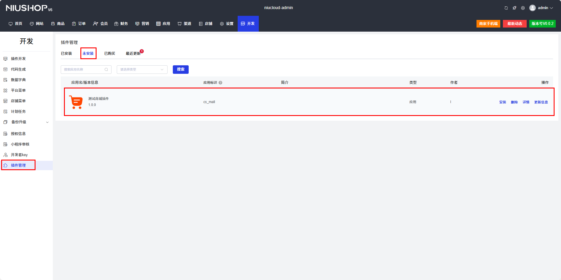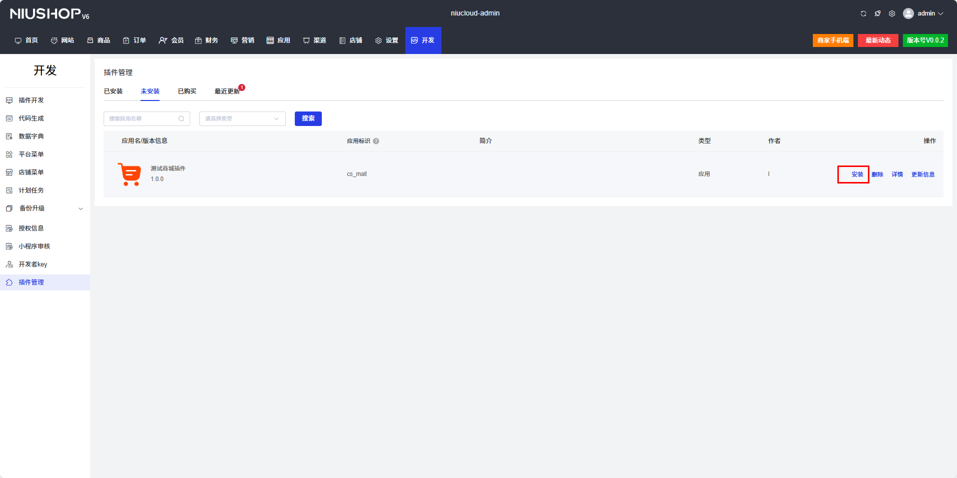 插件创建后处于未安装状态,需要先进行安装才能正常使用和开发。点击应用 -> 未安装列表对插件进行安装
