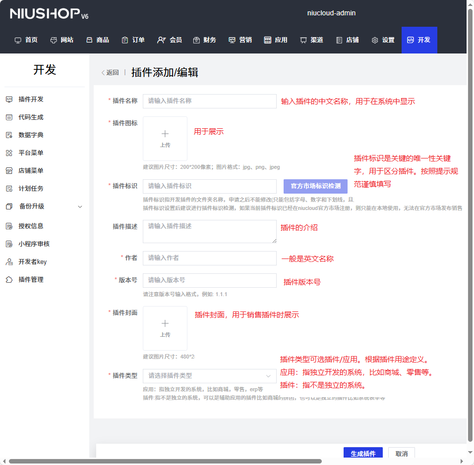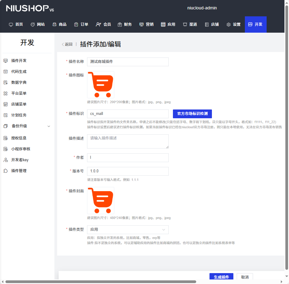 niucloud 设计了新建插件的功能,通过新建插件,开发者可以快速创建自己的插件。系统根据开发者设置初始化基础的插件代码,方便开发者后续开发