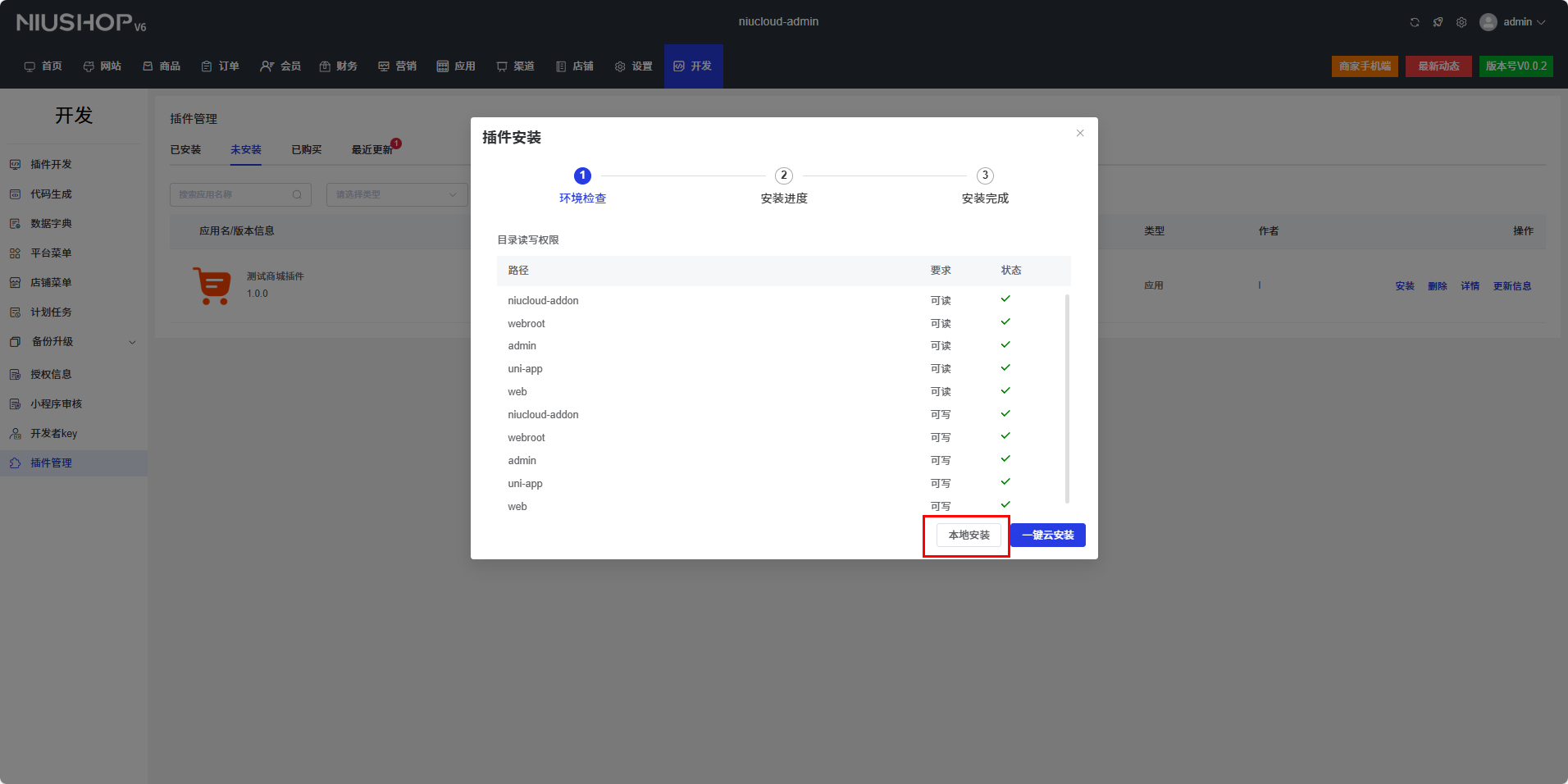 点击本地安装按钮,安装完成后,插件状态会切换为已安装