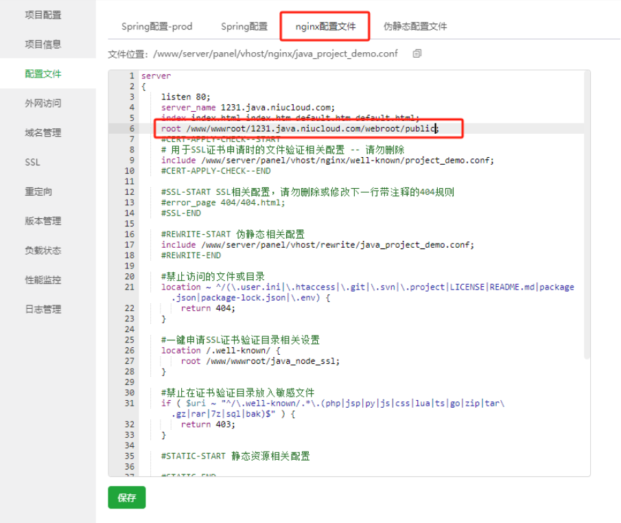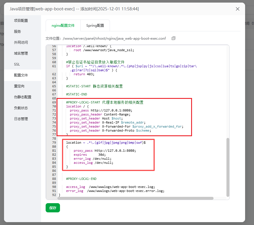 这里配置反向代理,这里的域名以及端口配置的是项目配置的内网域名以及端口,默认是127.0.0.1,端口是8080,配置之后可以外网域名访问。这里是图片对应伪静态的映射,如果配置文件中没有就要加上