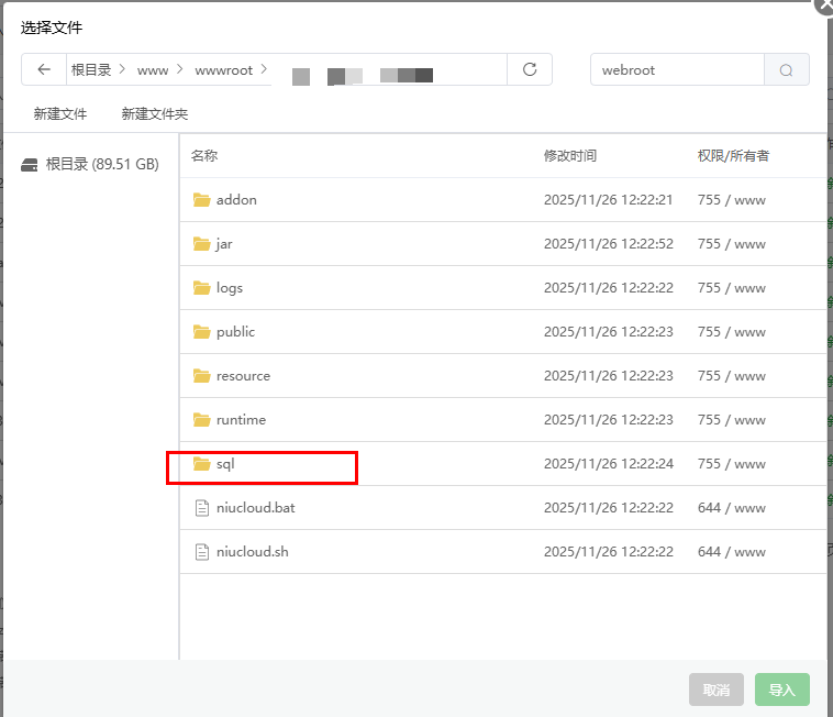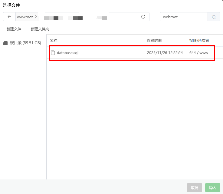 导入数据,导入的数据库位于 webroot 下的 sql 文件夹下