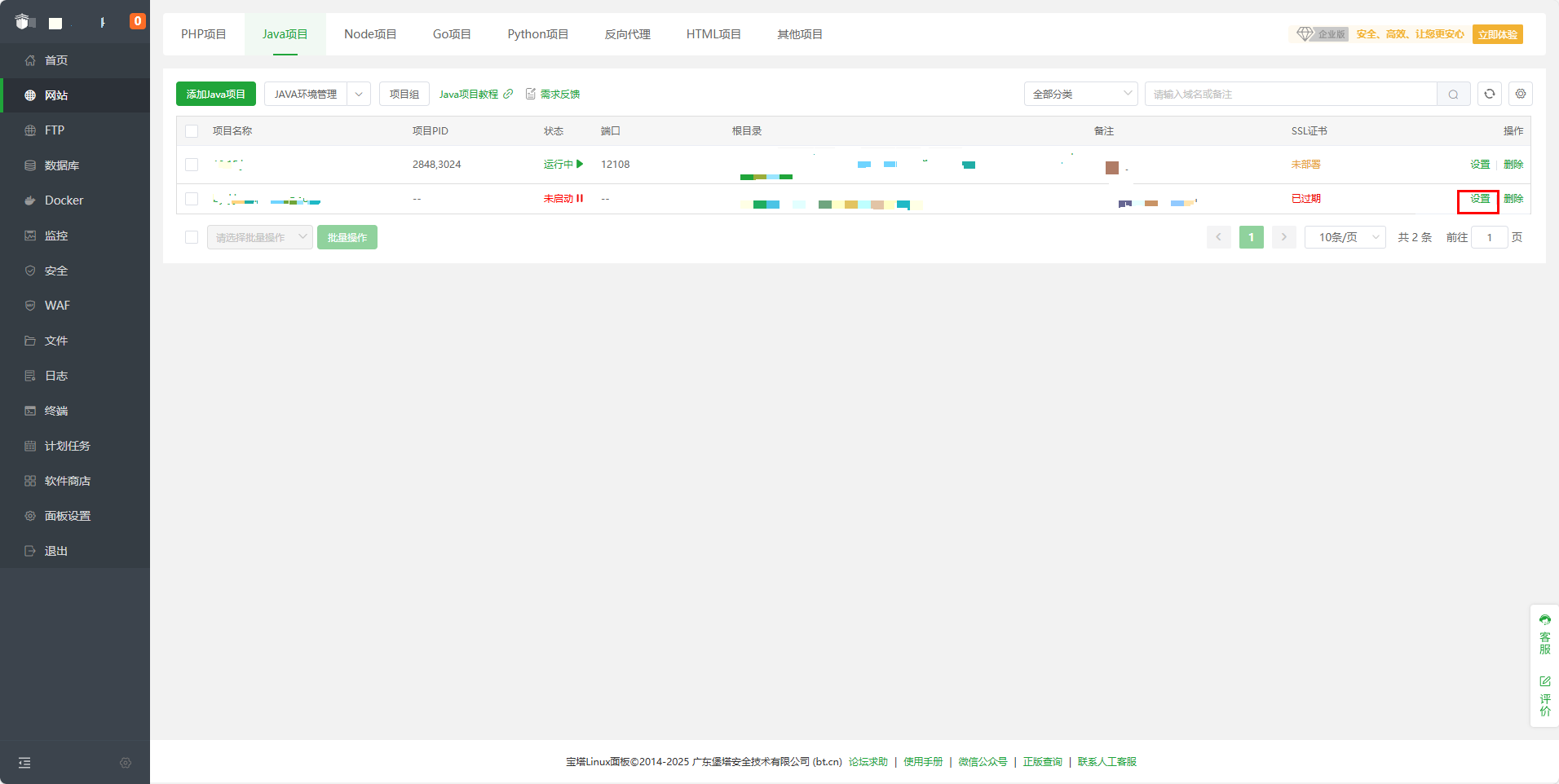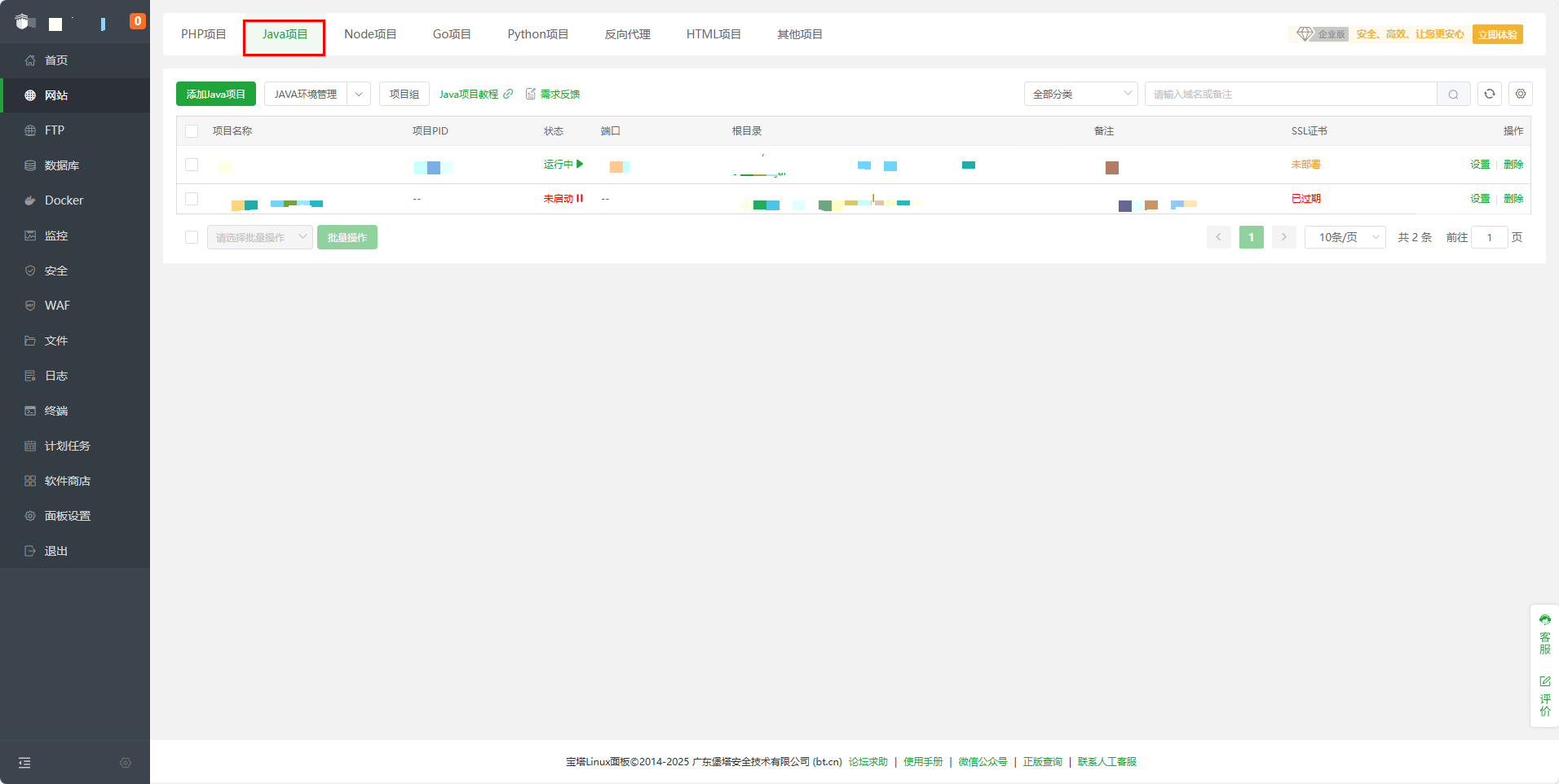 系统安装后按照提示安装初始化,选择 java 环境,初始化安装 nginx 、 java 、 mysql5.7 等环境