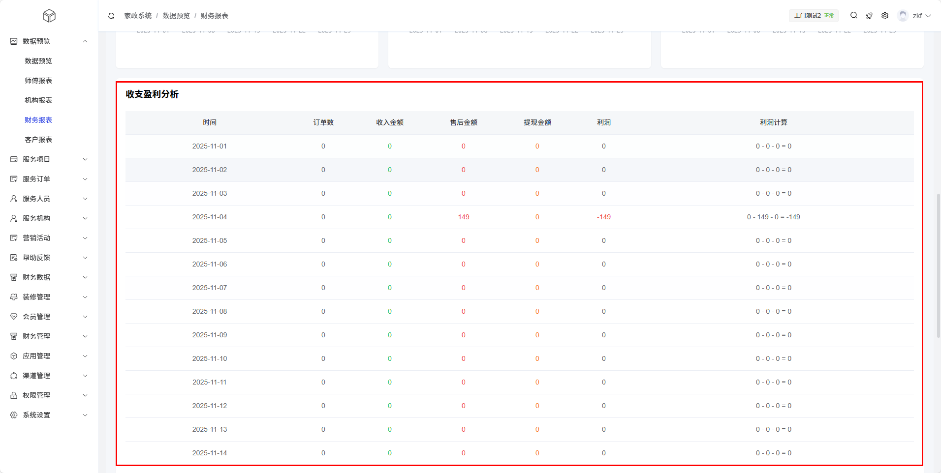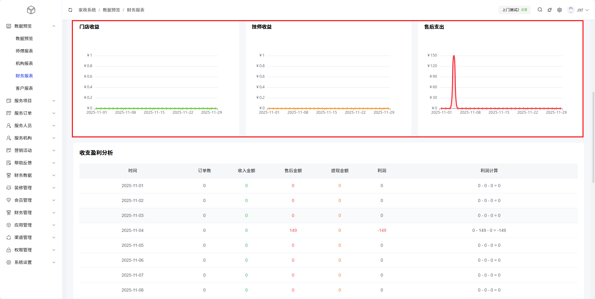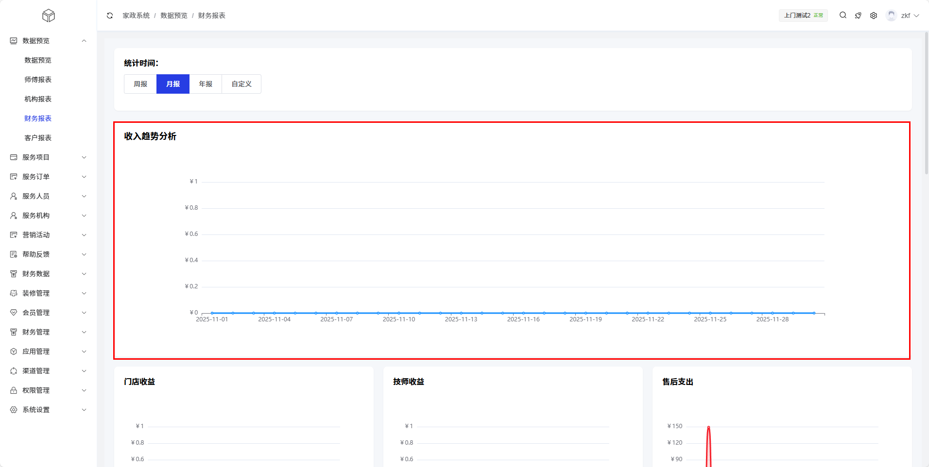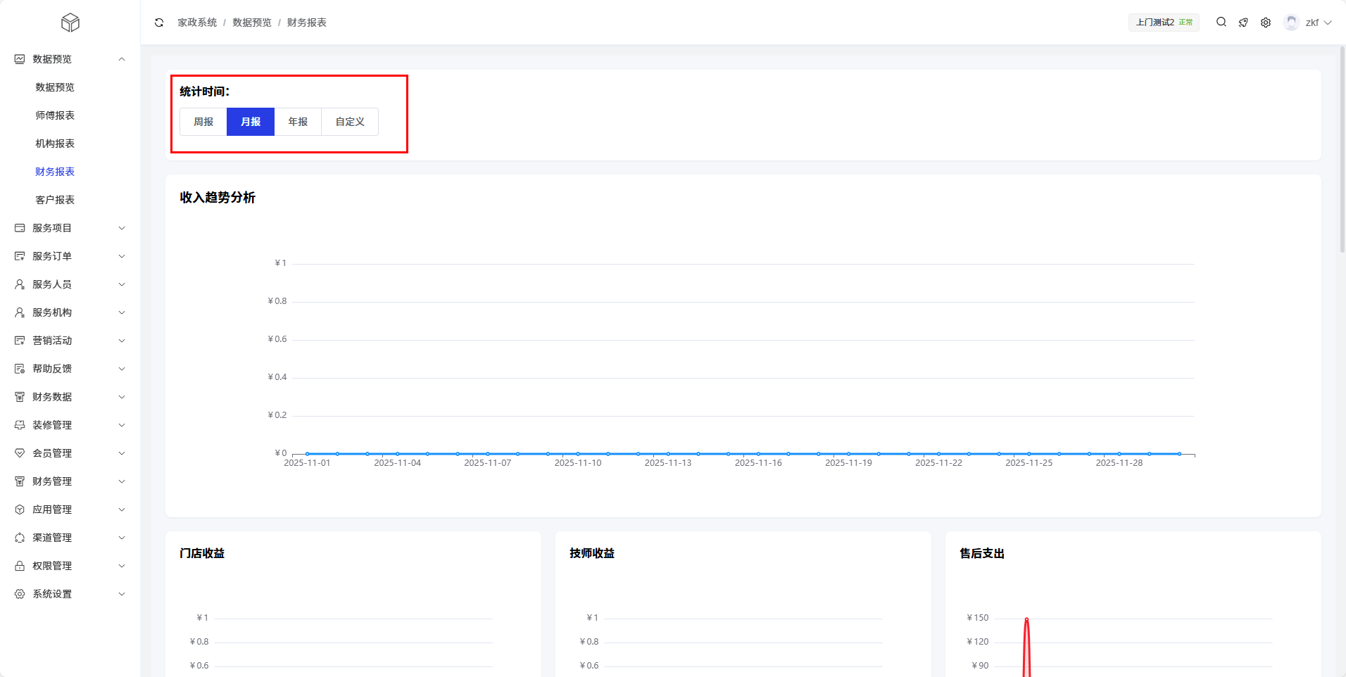 财务报表模块提供了上门家政业务的财务数据分析功能,帮助管理员全面了解收入、支出和盈利情况。