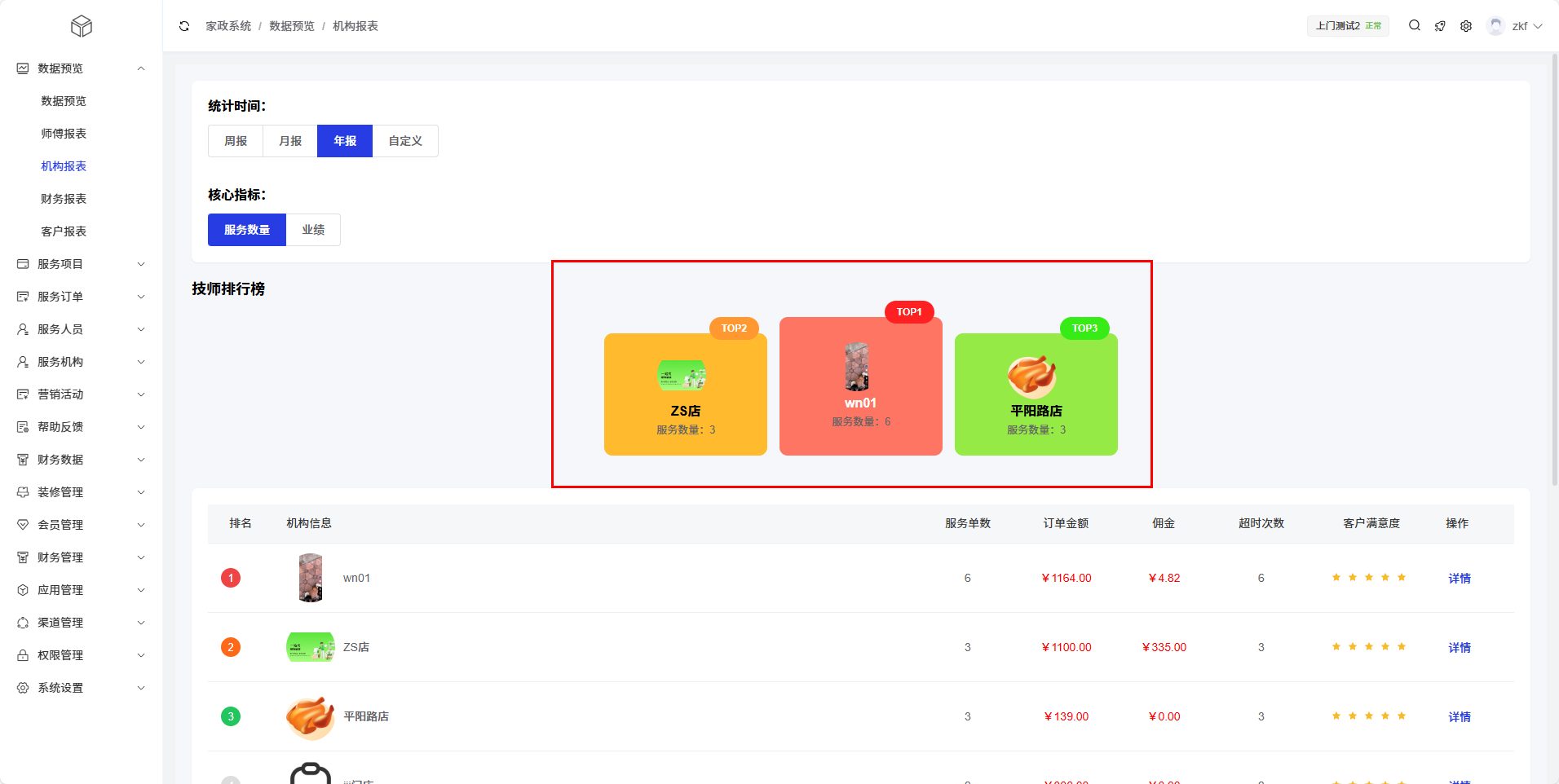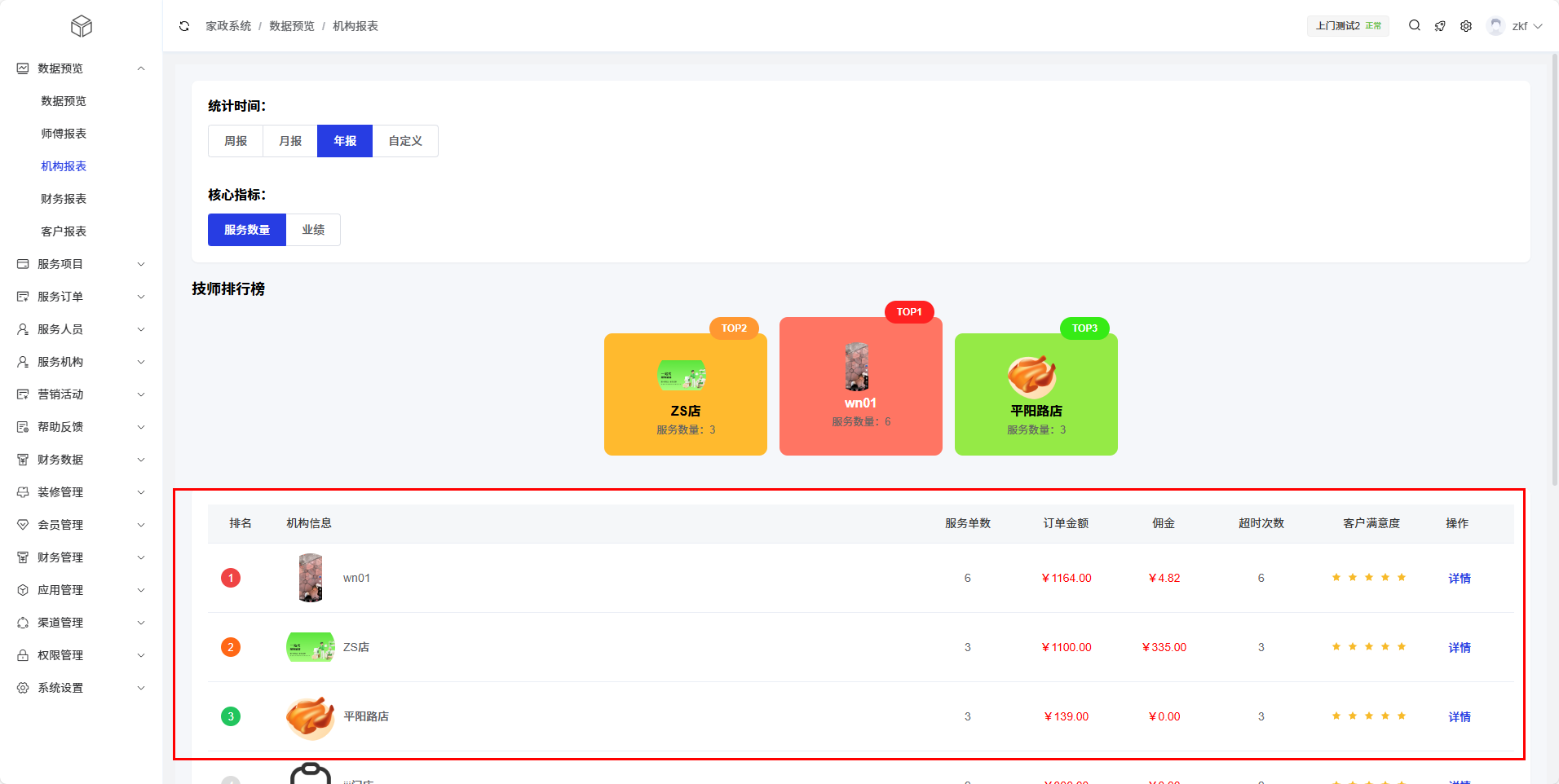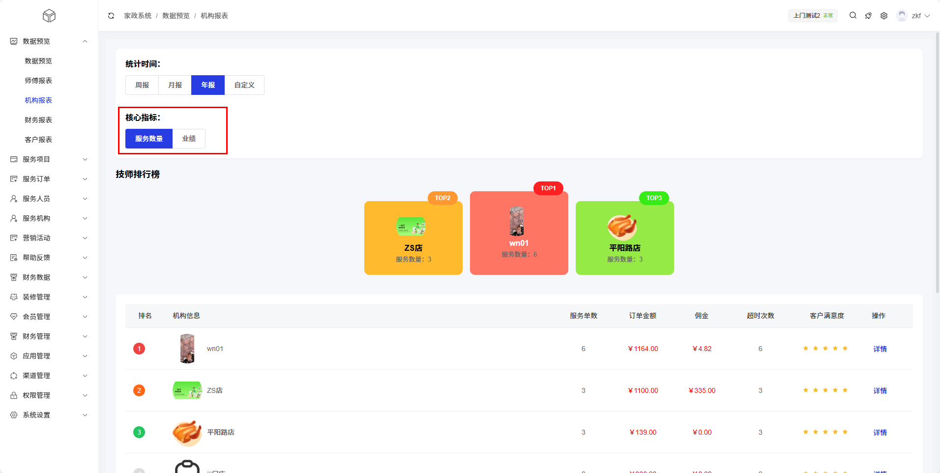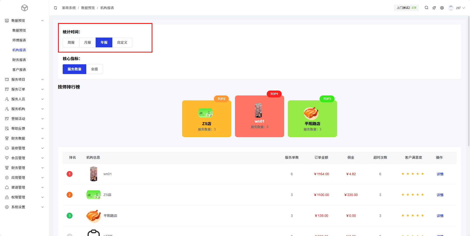 机构报表模块为管理员提供服务机构(门店)的详细运营数据统计和分析功能,帮助平台有效管理各个服务机构的绩效,了解不同机构的服务质量和业务量,优化机构管理策略。通过多维度的数据展示,管理员可以全面掌握各服务机构的运营状况。