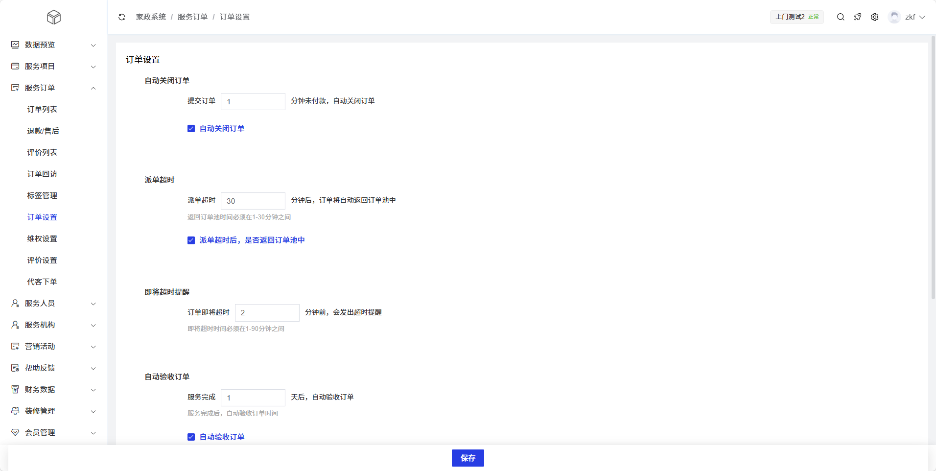 订单设置功能用于系统管理员配置订单的各项自动化规则和参数。通过这些设置,系统可以根据预设规则自动处理订单的关闭、派单超时提醒、预约时间等,提高订单管理的自动化程度和工作效率。