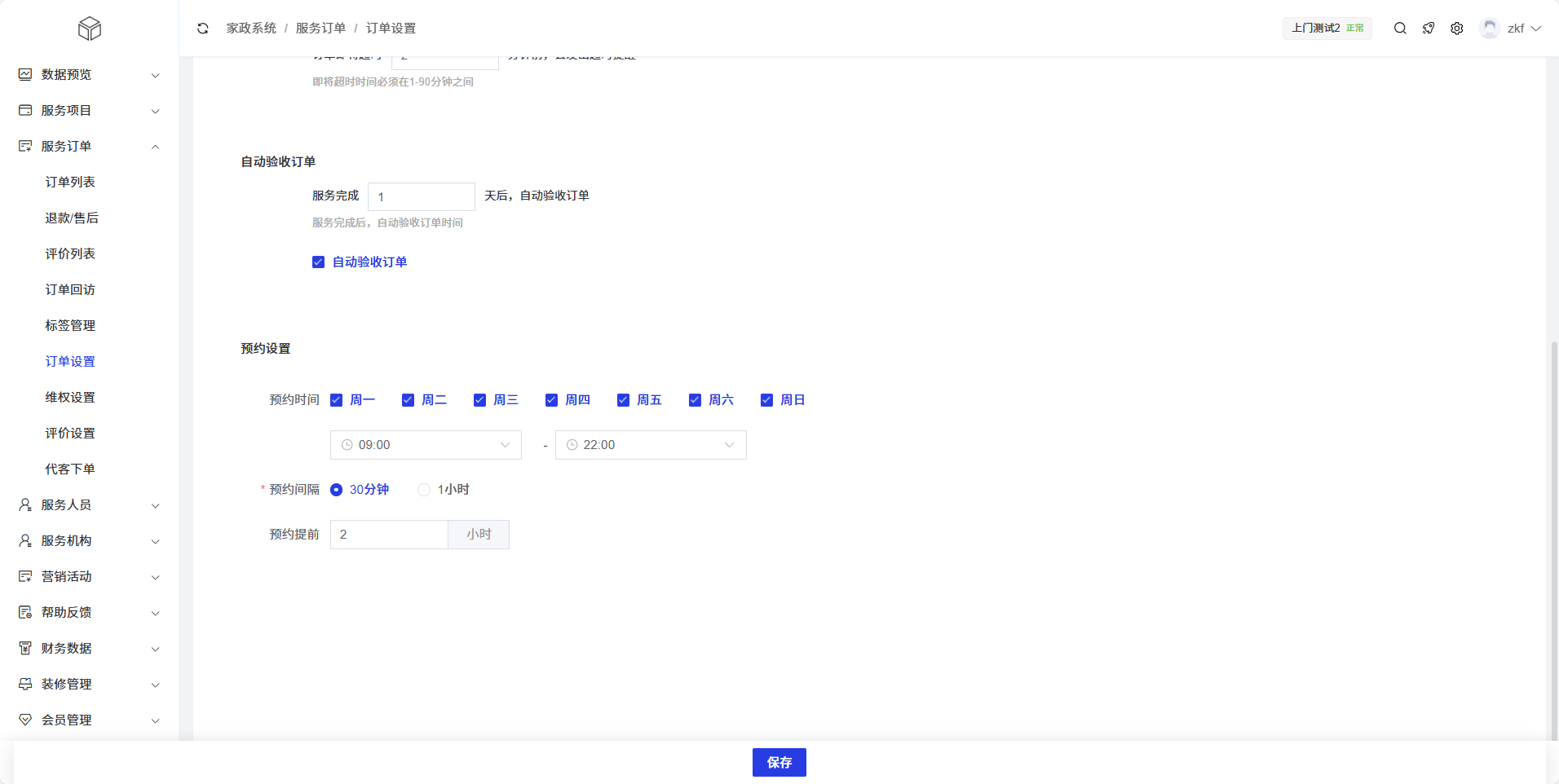 该功能用于设置系统自动验收已完成订单的规则:服务完成后,经过指定天数,系统将自动验收订单