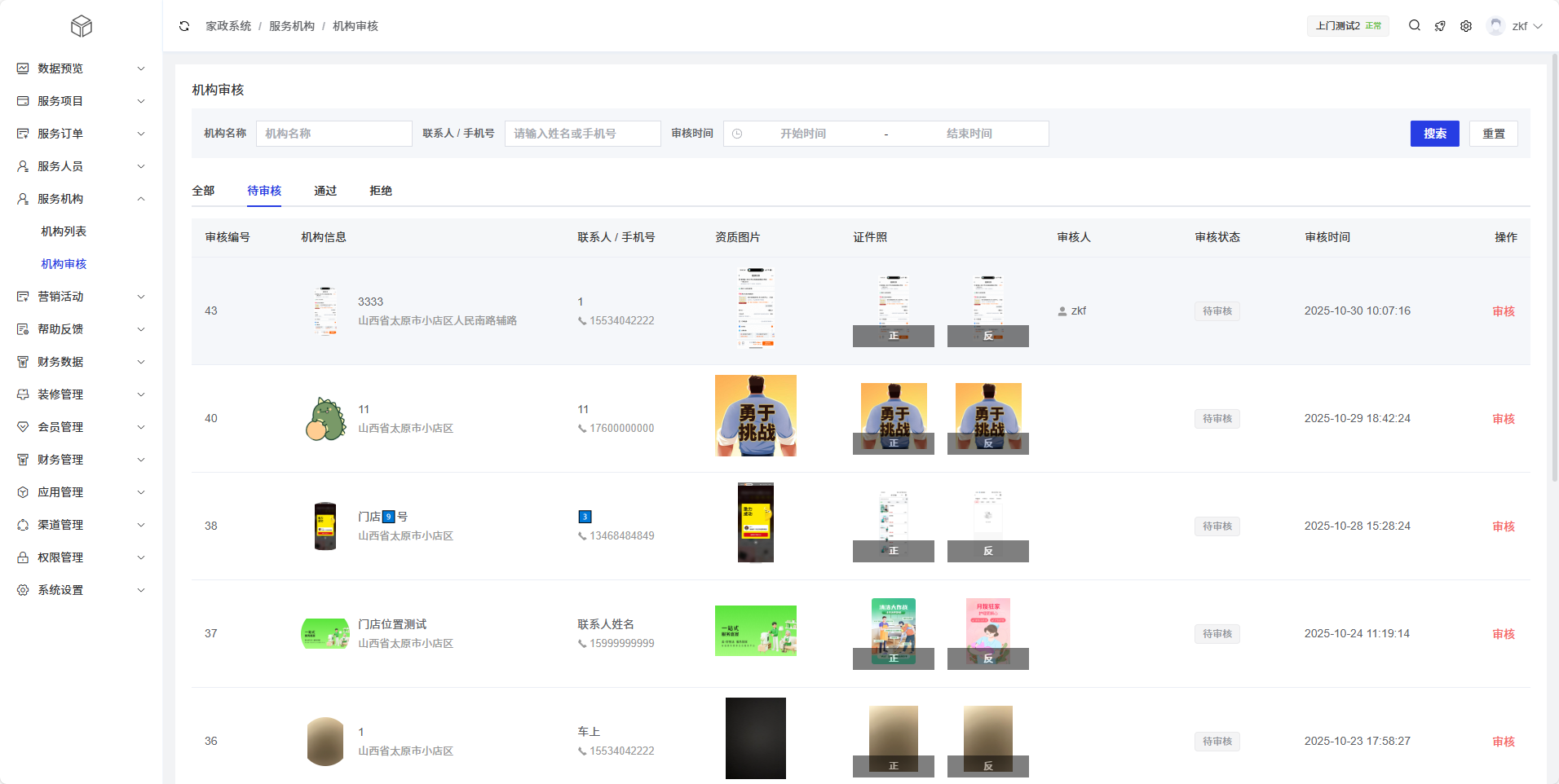 显示机构编号、机构名称、联系人信息、证件信息、运营照片、审核状态、审核时间等