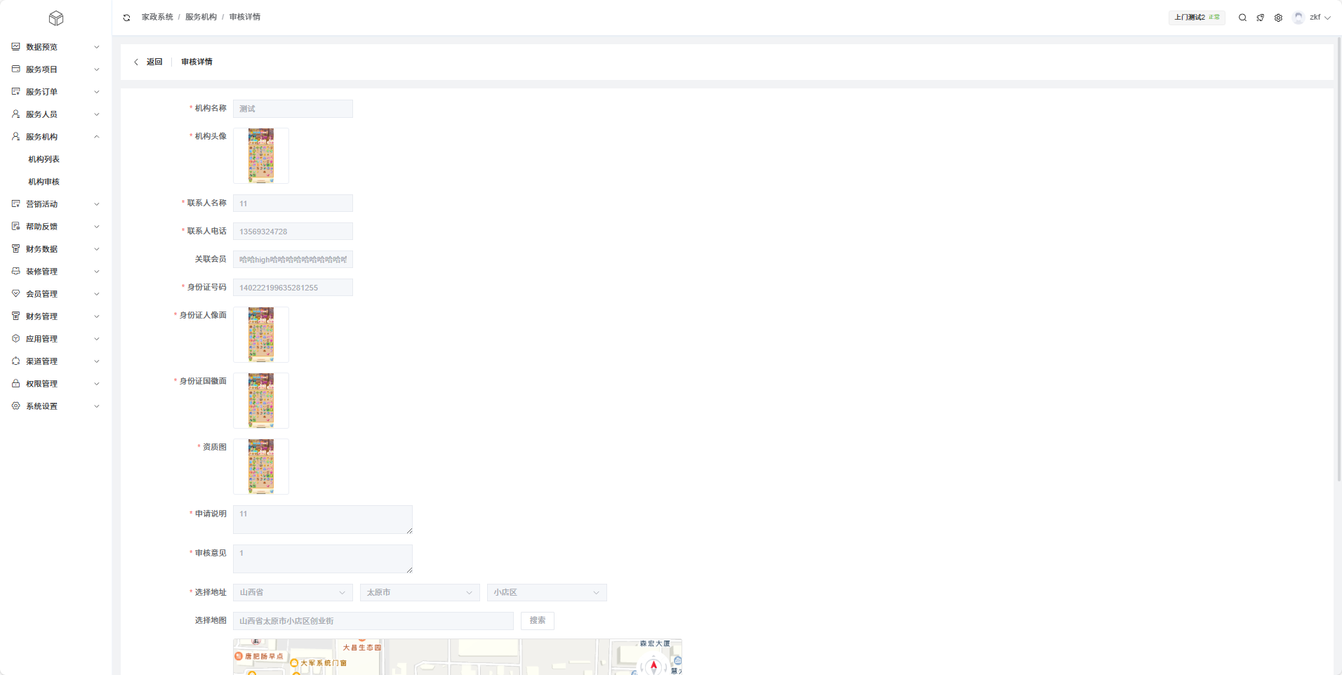 显示机构头像、机构名称、联系人信息、证件信息、审核状态等