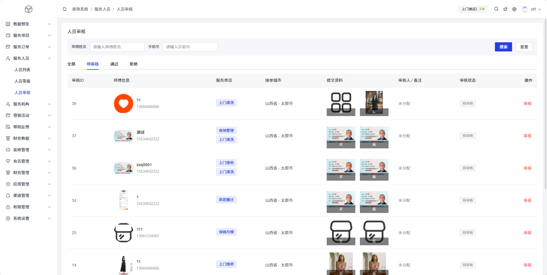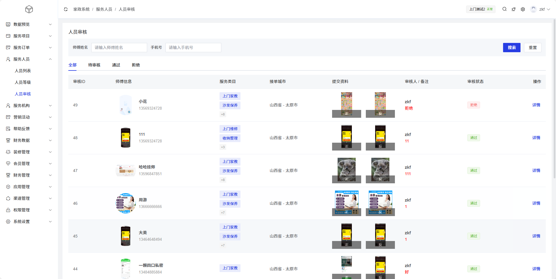 人员审核页面提供了搜索功能,通过师傅姓名、手机号快速查找特定服务人员的审核记录。