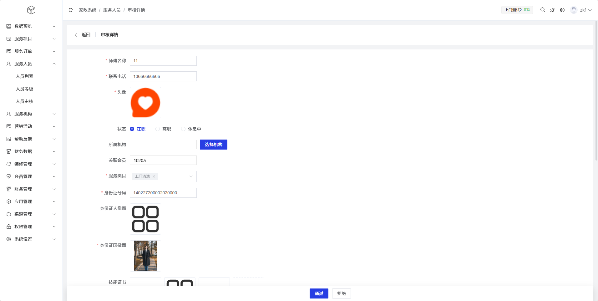对于已完成审核的服务人员(通过或拒绝状态),管理员可以查看其详细信息: